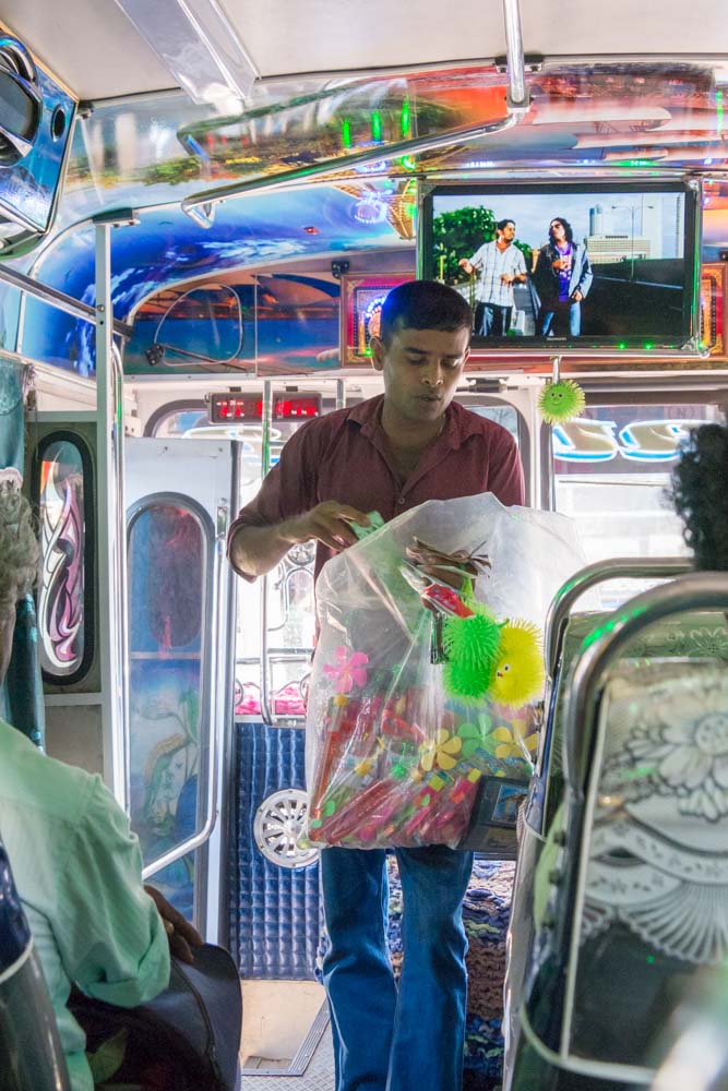 Nous avons pris le train jusqu’à Puttalam. Pas de problème pour avoir de la place assise, il y en a plein. Mais, ensuite, le bus qui part de Puttalam est bourré à craquer et réussir à grimper dedans avec les bagages n’est pas une mince affaire. Heureusement, les gens sont très aimables et nous aident, ils nous offrent même leurs places assises (eu égard à nos cheveux blancs?).