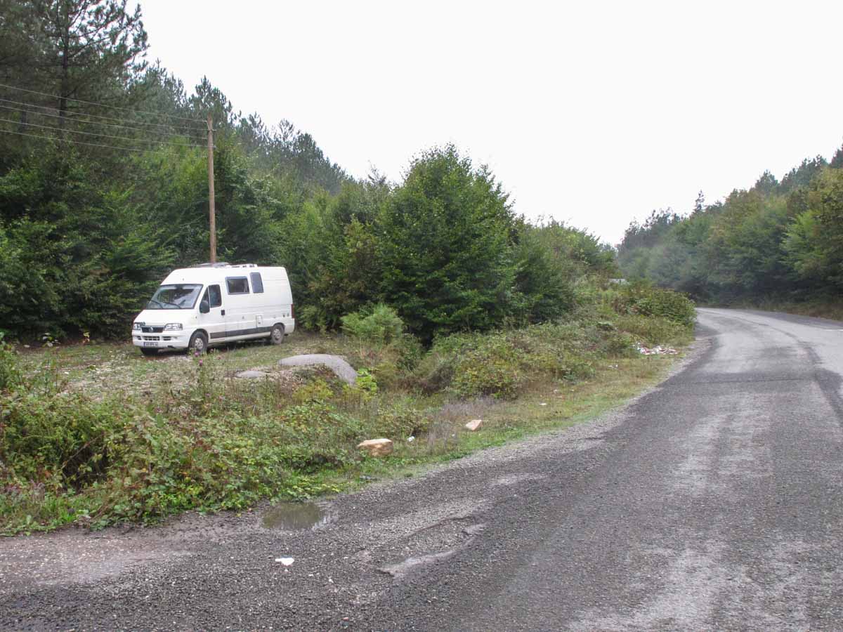 Comme le temps et la route sont plutôt mauvais – il pleut et il commence à faire sombre – nous cherchons un endroit où nous arrêter pour la nuit sans nous embourber…