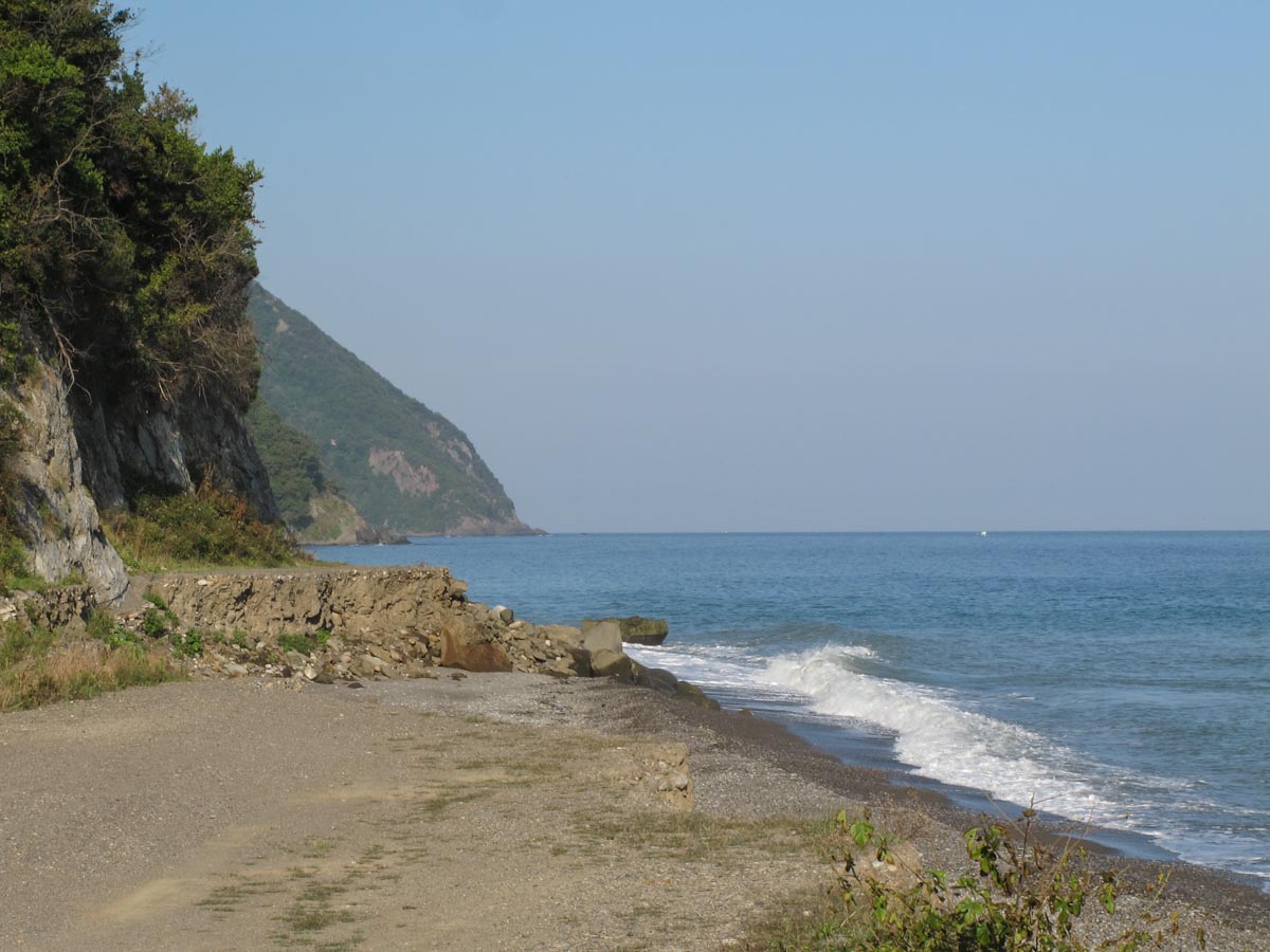 Ensuite la route descend le long du rivage et suit une grande plage de galets (avant le village de Kumluka), où se promènent quelques vaches…