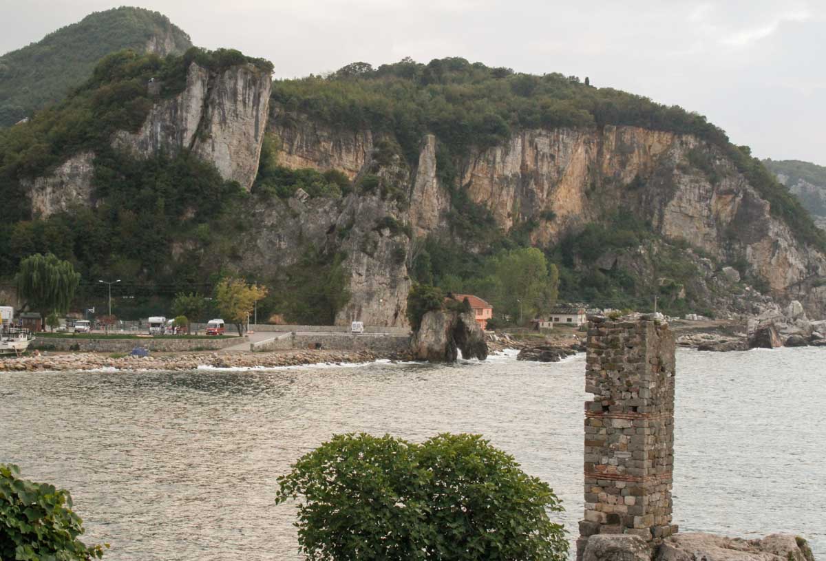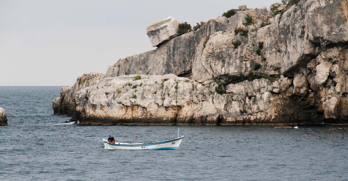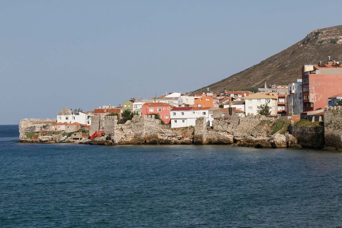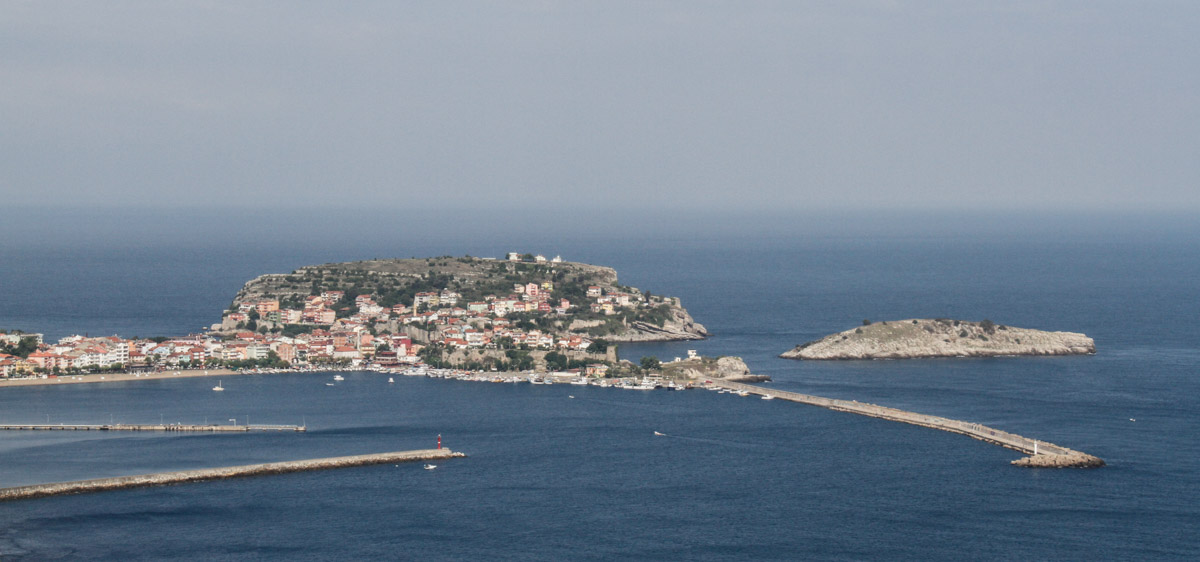 Amasra, bâtie sur un isthme, est bordée par la mer des deux côtés : à l'ouest, se trouve le petit port (où nous sommes garés) et à l'est, le grand port et sa plage de sable.