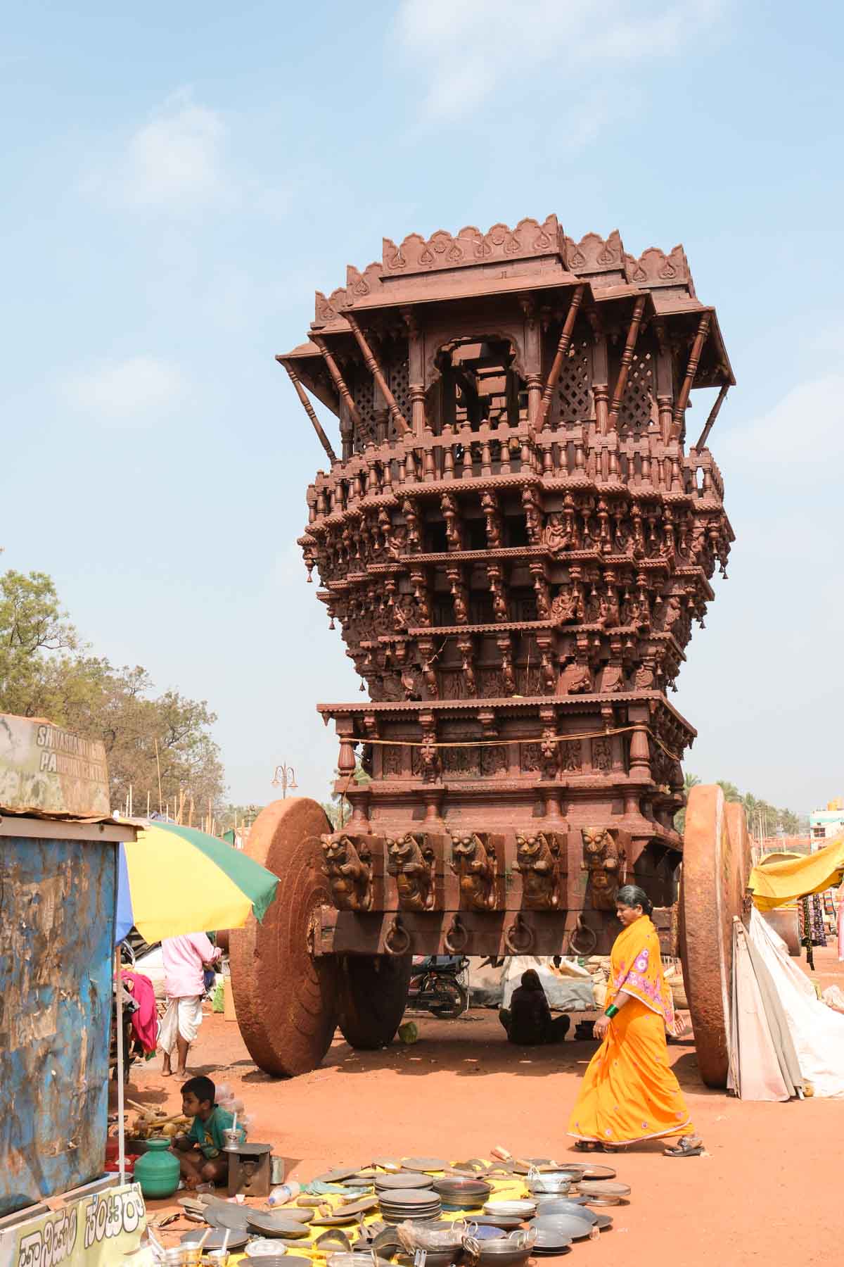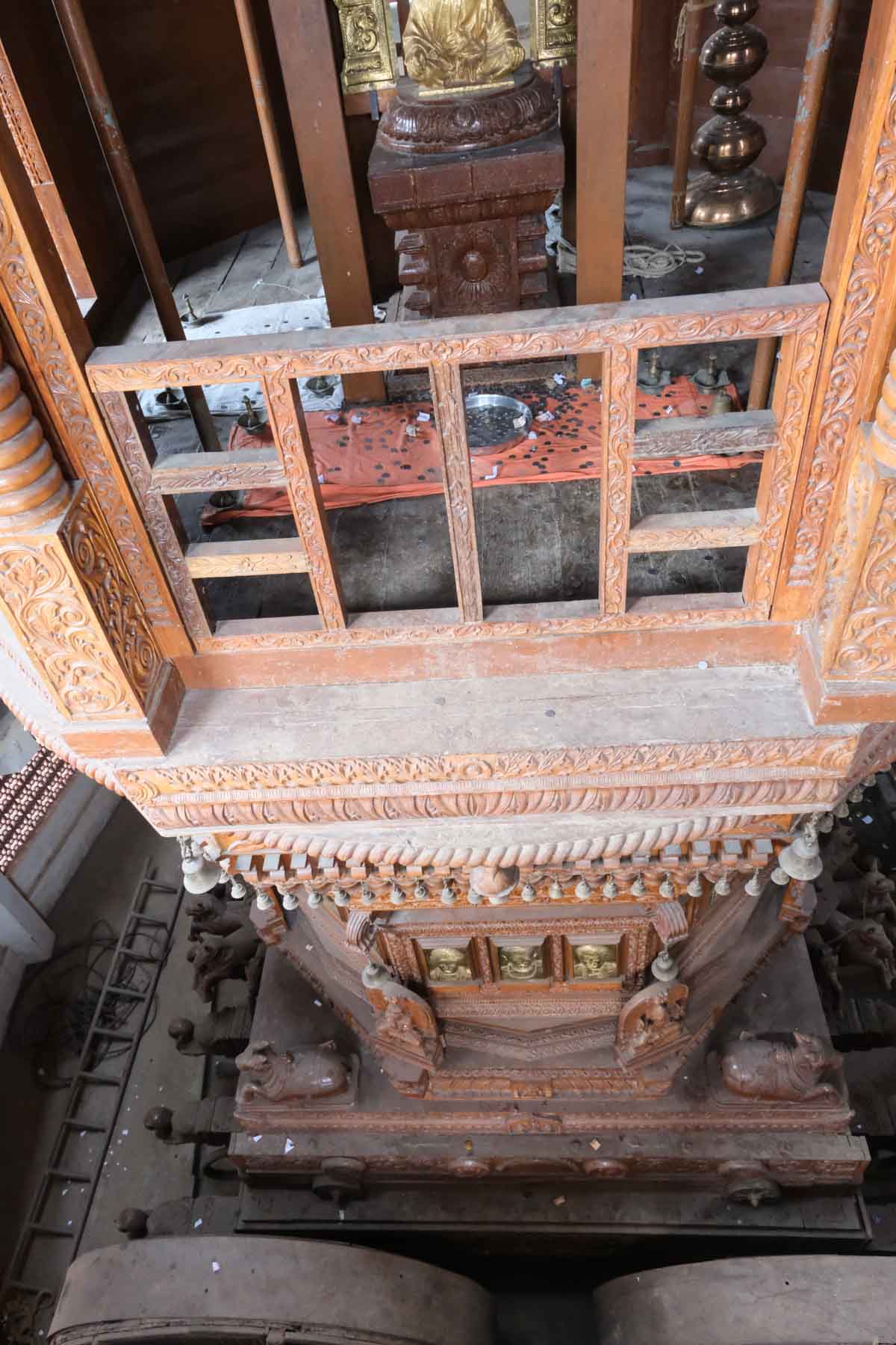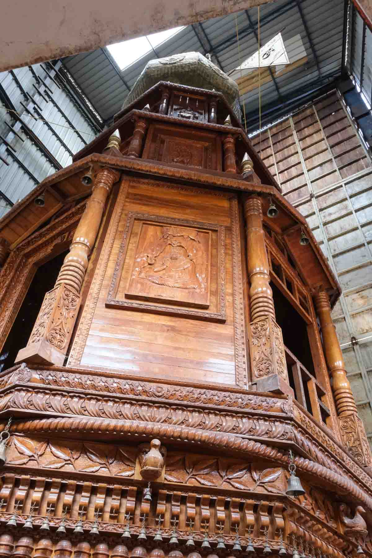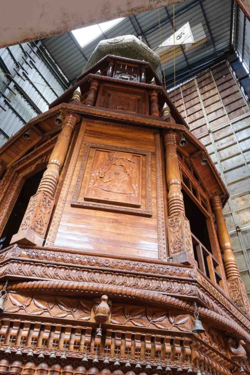Des escaliers permettent de grimper plusieurs étages afin de voir les différentes parties de ce chariot. On nous dit que c’est le deuxième plus grand chariot au monde, le premier étant à Puri, en Orissa.