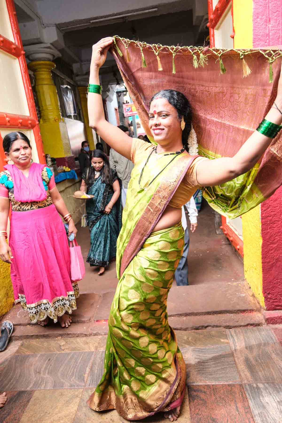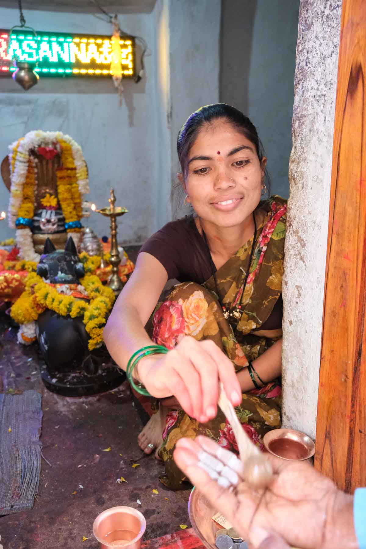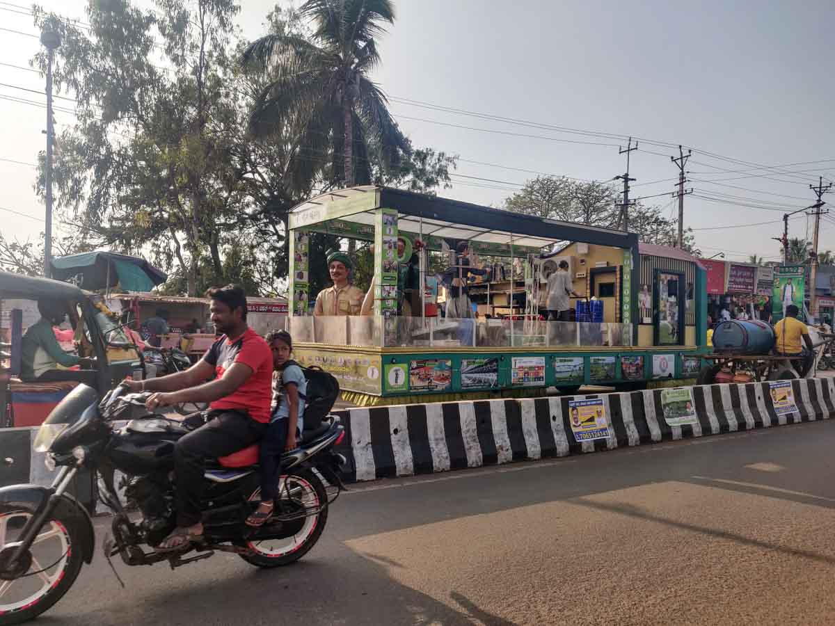 Ce temple, situé à Cholachagudda, est précédé d’un immense marché très animé. Sans doute est-ce parce que nous sommes en période de festival qu’il y a autant d’animation… En tout cas, ça nous plait bien … Nous retrouvons enfin la folle ambiance de l’Inde hindoue !