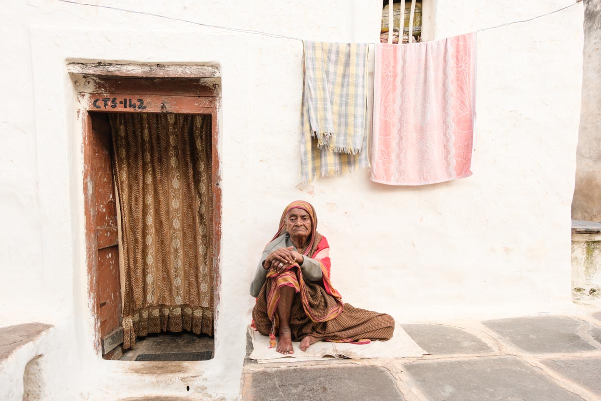 Une dame enfile des perles sur son seuil