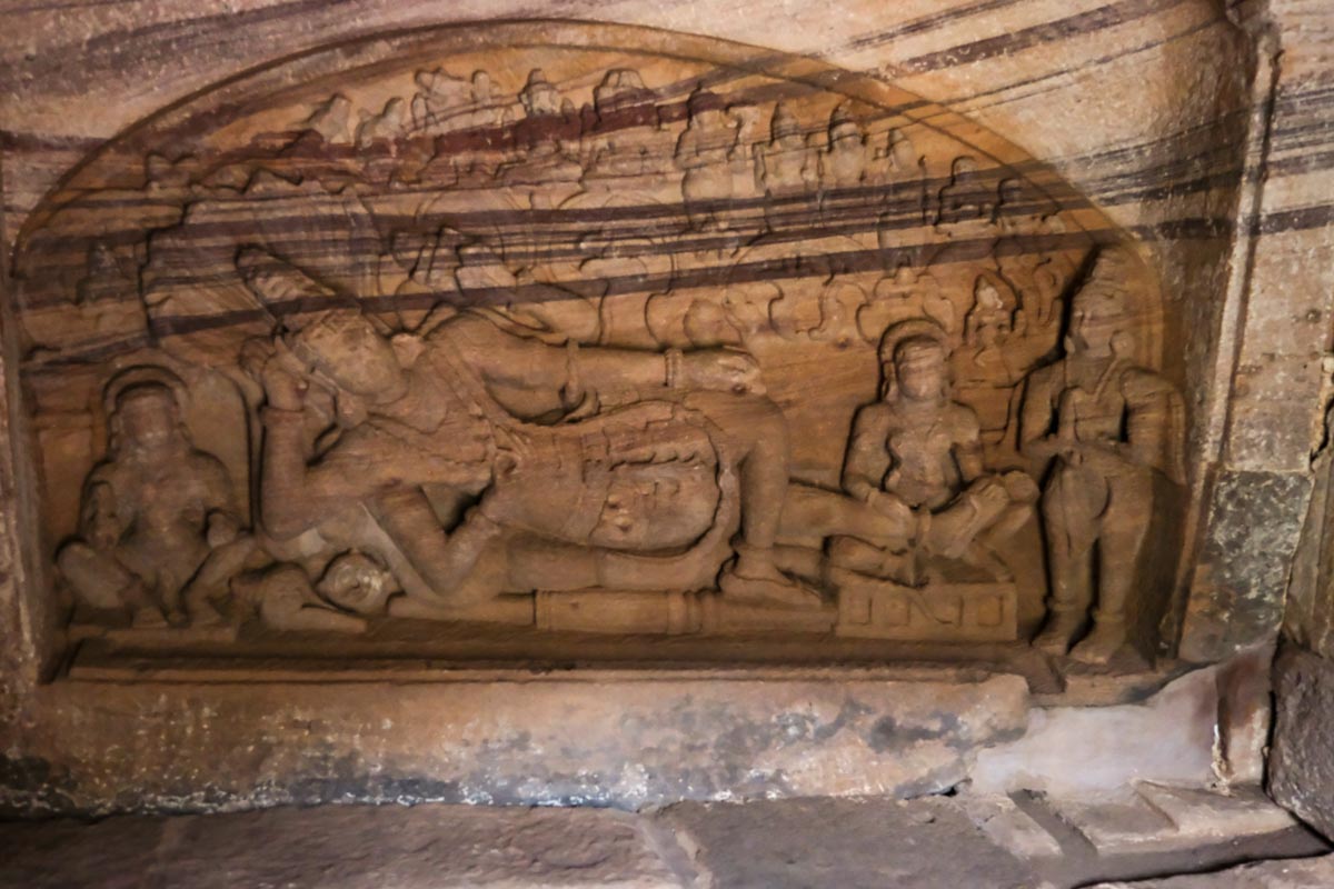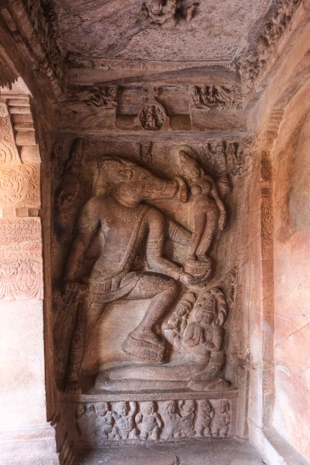 À l'intérieur, bas-relief représentant Vishnou allongé