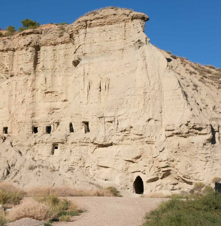 À Arguedas, il y a un grand parking bordé de collines percées d’anciennes ouvertures troglodytiques …