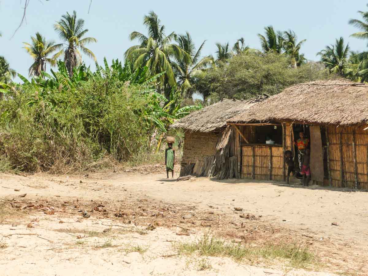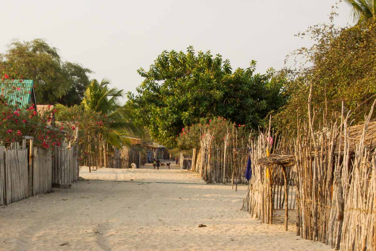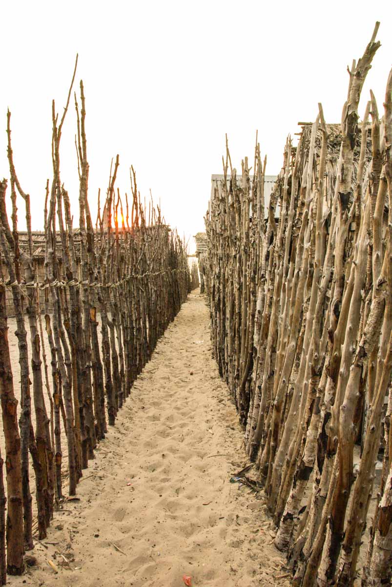 Les paillotes et maisonnettes en bois sont entourées de petits enclos fermés par des sortes de palissades ajourées faites de pieux enfoncés verticalement dans le sol. Ces palissades délimitent les rues du village. Ici, on marche dans le sable. Pas de véhicules à moteur, c’est le calme absolu.