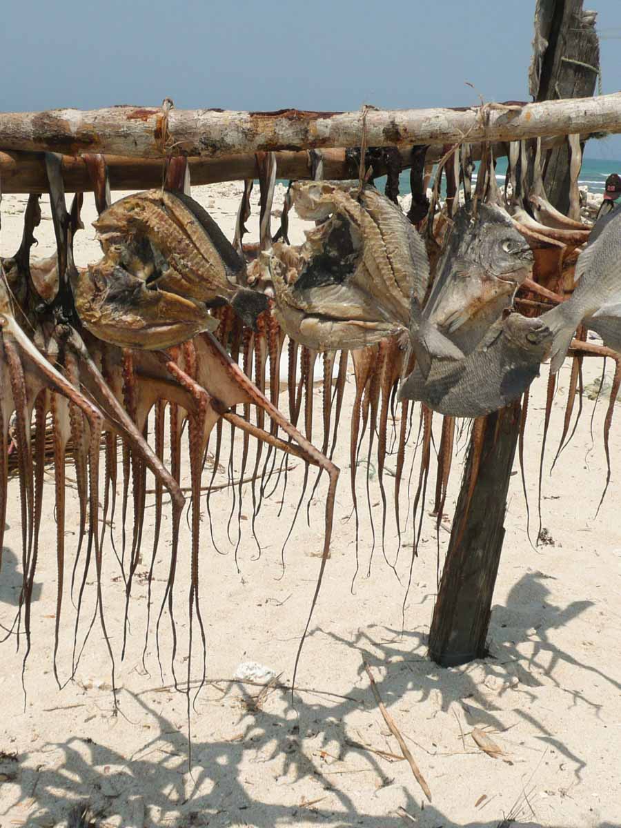Les poissons et les poulpes sont salés et séchés au soleil...