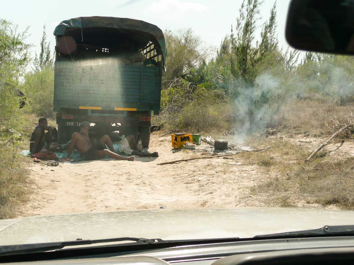 Tout à coup, voilà un camion en panne au milieu de la piste. Ses occupants campent là en attendant le retour de celui qui est parti chercher la pièce de remplacement, ça peut prendre pas mal de temps (plusieurs jours)… Pas de problème, nous nous traçons une autre piste dans les broussailles à côté…ça secoue un peu, mais ça passe…