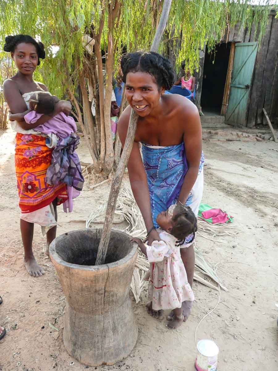 A Madagascar, il y a des plantations de café et, souvent, lorsque l’on passe près d’un village, ça sent bon le café grillé… Après ça, il faut le moudre, mais ici, c’est avec un pilon et un mortier que ça se fait…