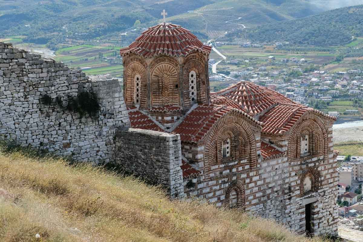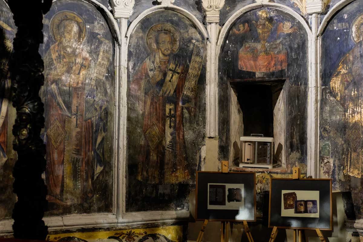 Au pied des fresques presque effacées, se trouve la cachette où furent découverts les Codex pourpres de Berat, en 1967.