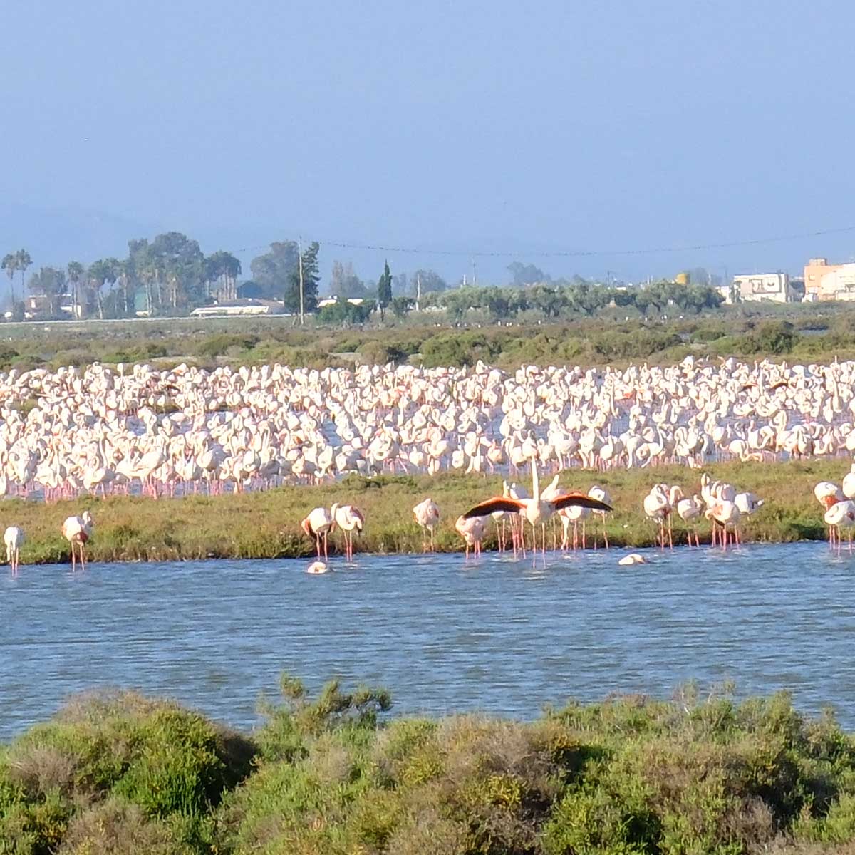 En fin d’après-midi, nous allons voir les flamants roses sur la lagune. Il y en a une énorme colonie …
