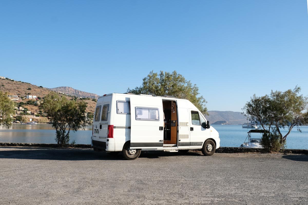 Il y a un grand parking le long de la mer où nous nous garons pour la nuit : 35.1842 – 25.903 099
