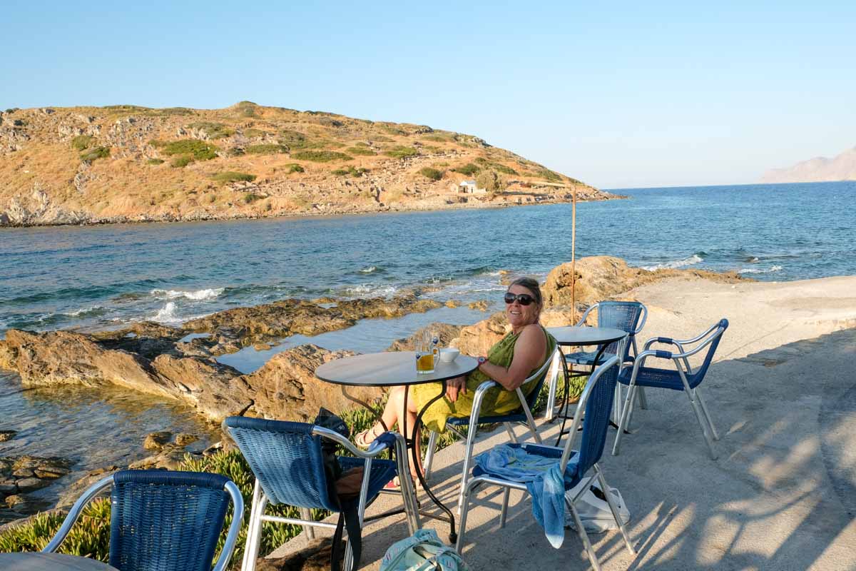 Après la baignade, une bonne bière dégustée à une petite table au-dessus de la mer face à l’île de Mochlos …
