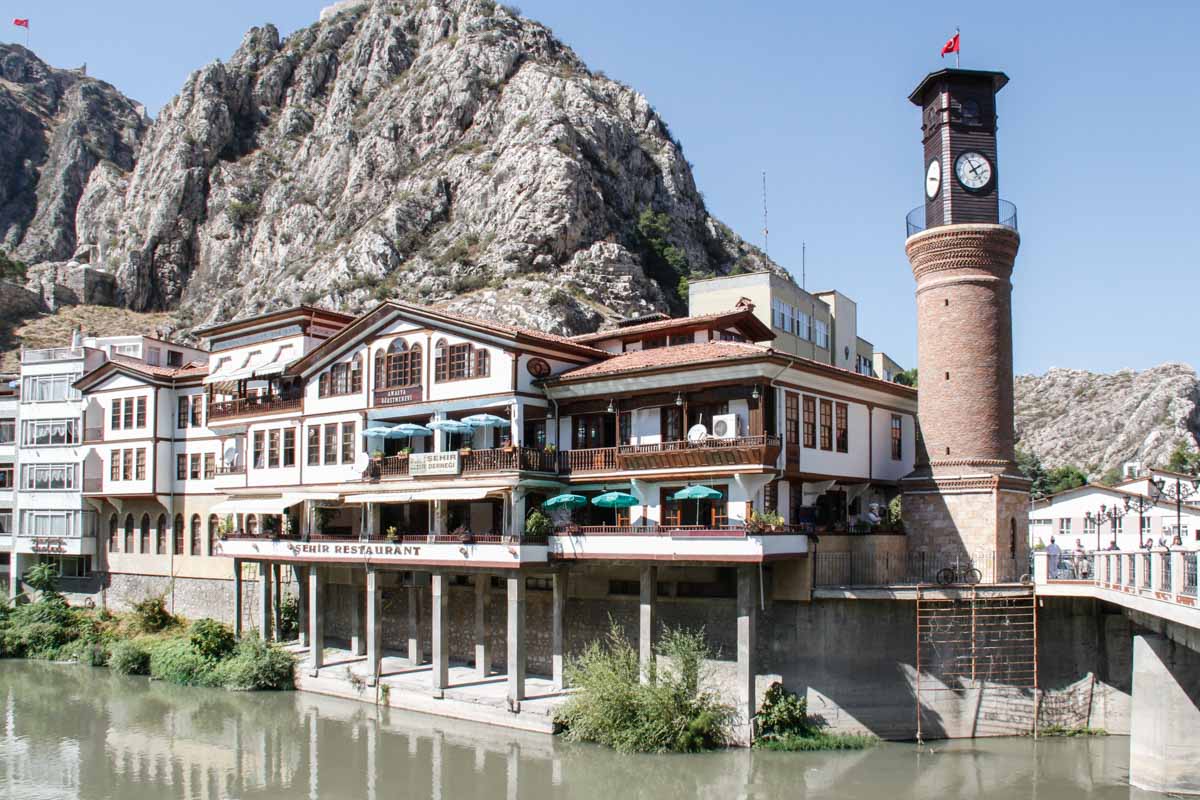 Au restaurant « Amasya Sehir Kulübü », sur le balcon au-dessus de l’eau, nous nous régalons de « pide ». Près du restau, il y a une tour à horloge.
