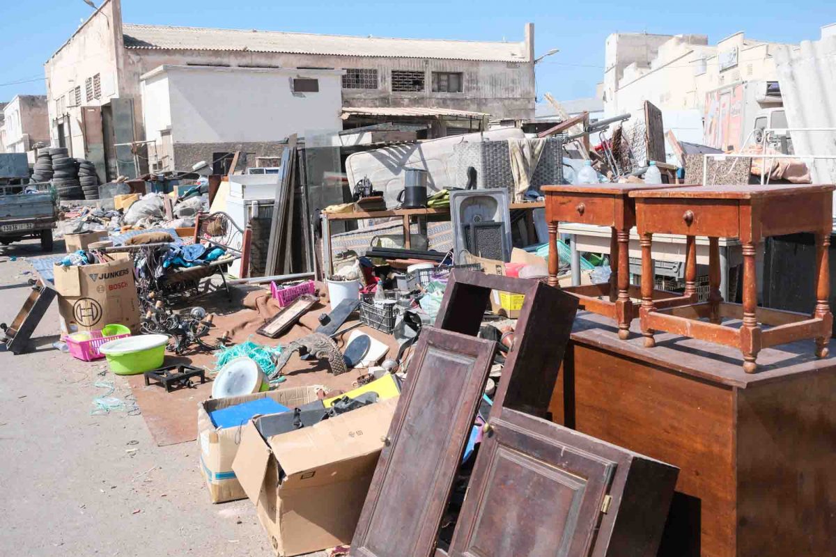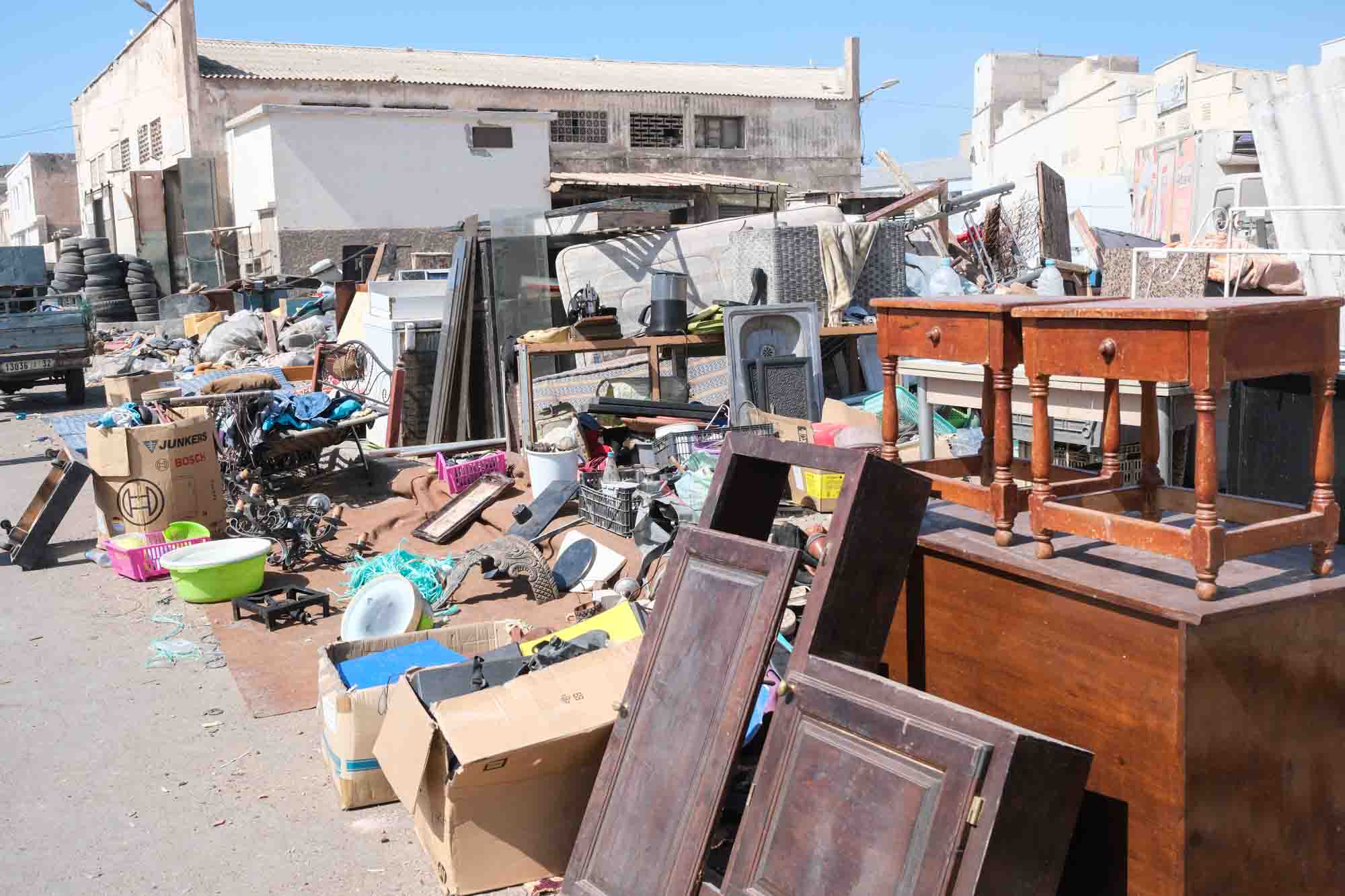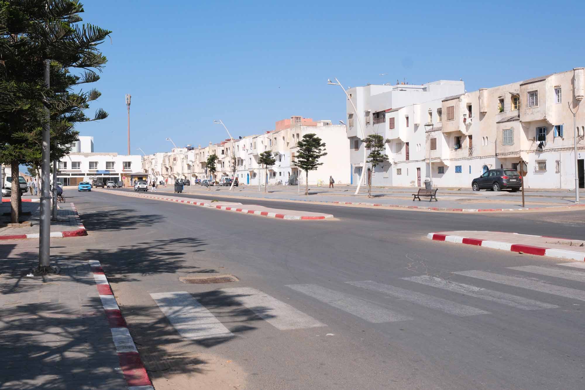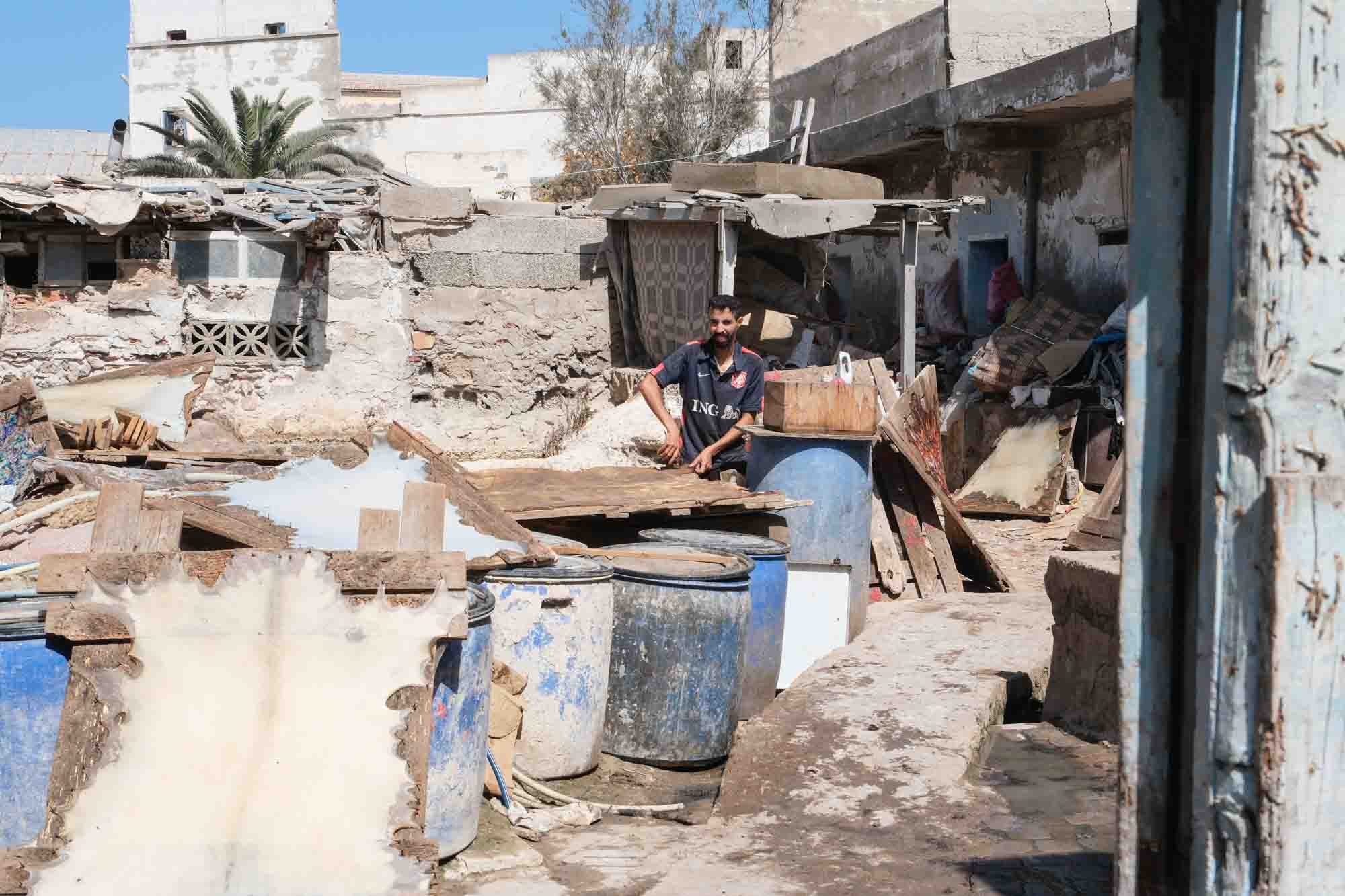 Nous nous garons sur un parking près d’un petit supermarché à environ 1,5 km de la médina et partons à pied en longeant la grande avenue où se succèdent, d’abord des immeubles, puis tout un bric-à-brac, une tannerie, des garages, des menuiseries, des entrepôts …