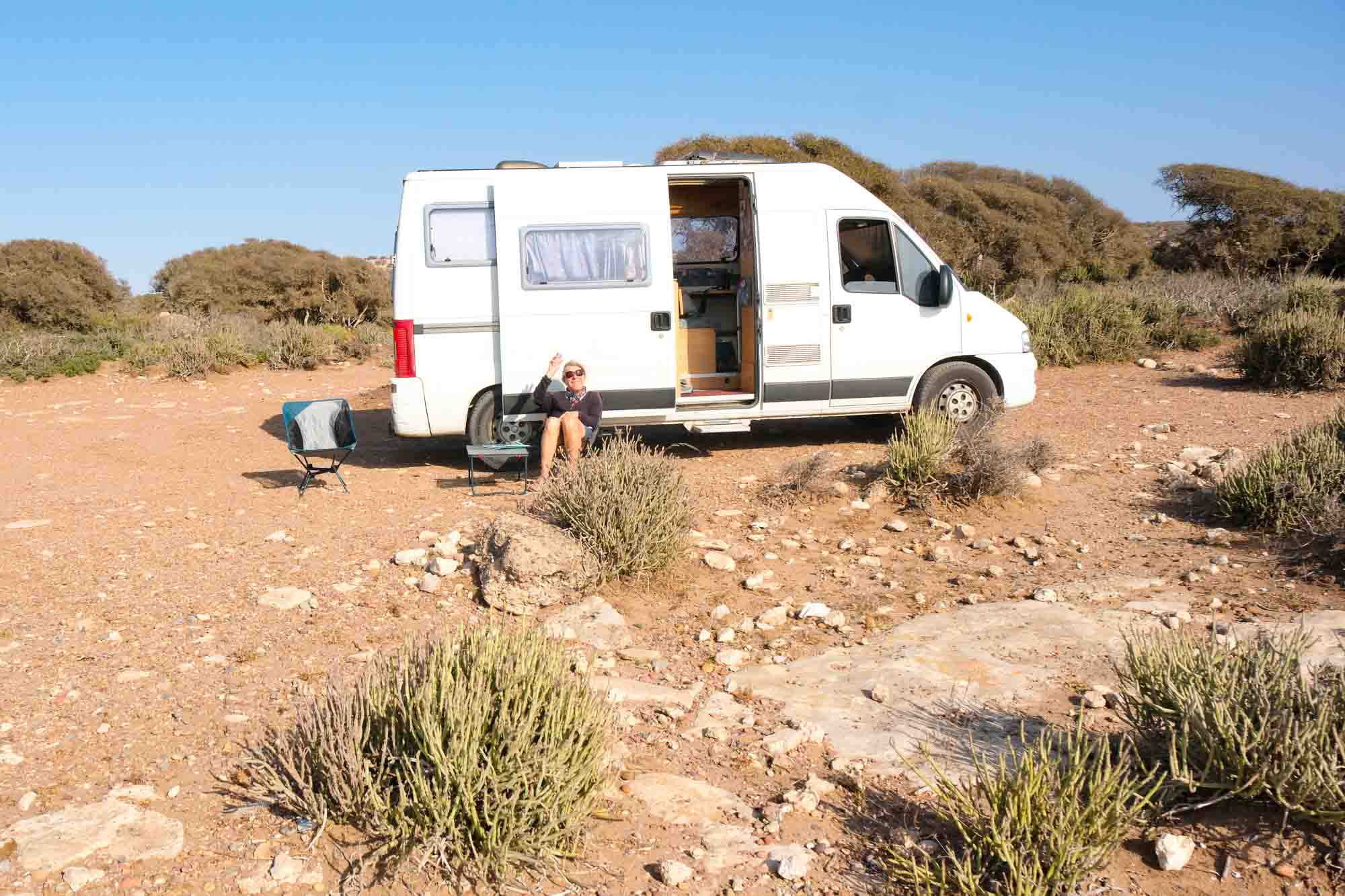 Du coup, nous dépassons Sidi-Kaouki et allons nous poser dans les dunes plantées d’arganiers et de petits buissons d’épineux. Pour y arriver, il faut suivre une piste caillouteuse et cahoteuse.