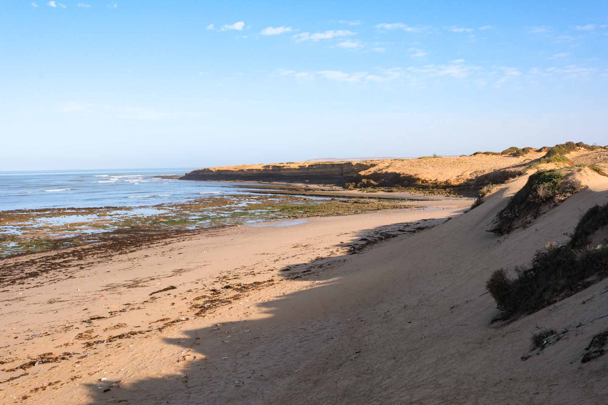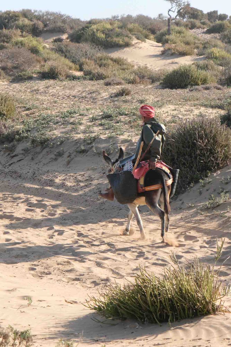 Nous descendons en bas des dunes jusqu’à la plage. La mer est basse. Quelques personnes pêchent à la ligne et d’autres grattent dans les rochers. Certains emportent leur récolte (coquillages ou algues ?) dans des paniers à dos d’âne…
