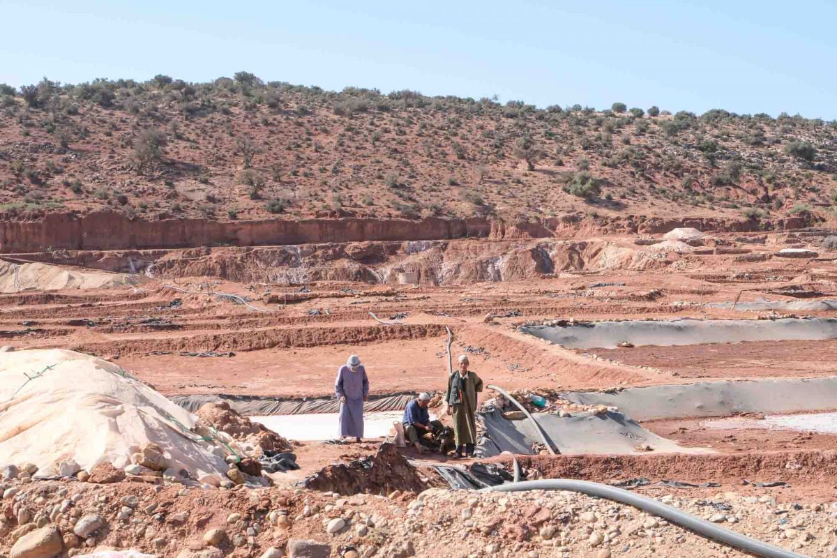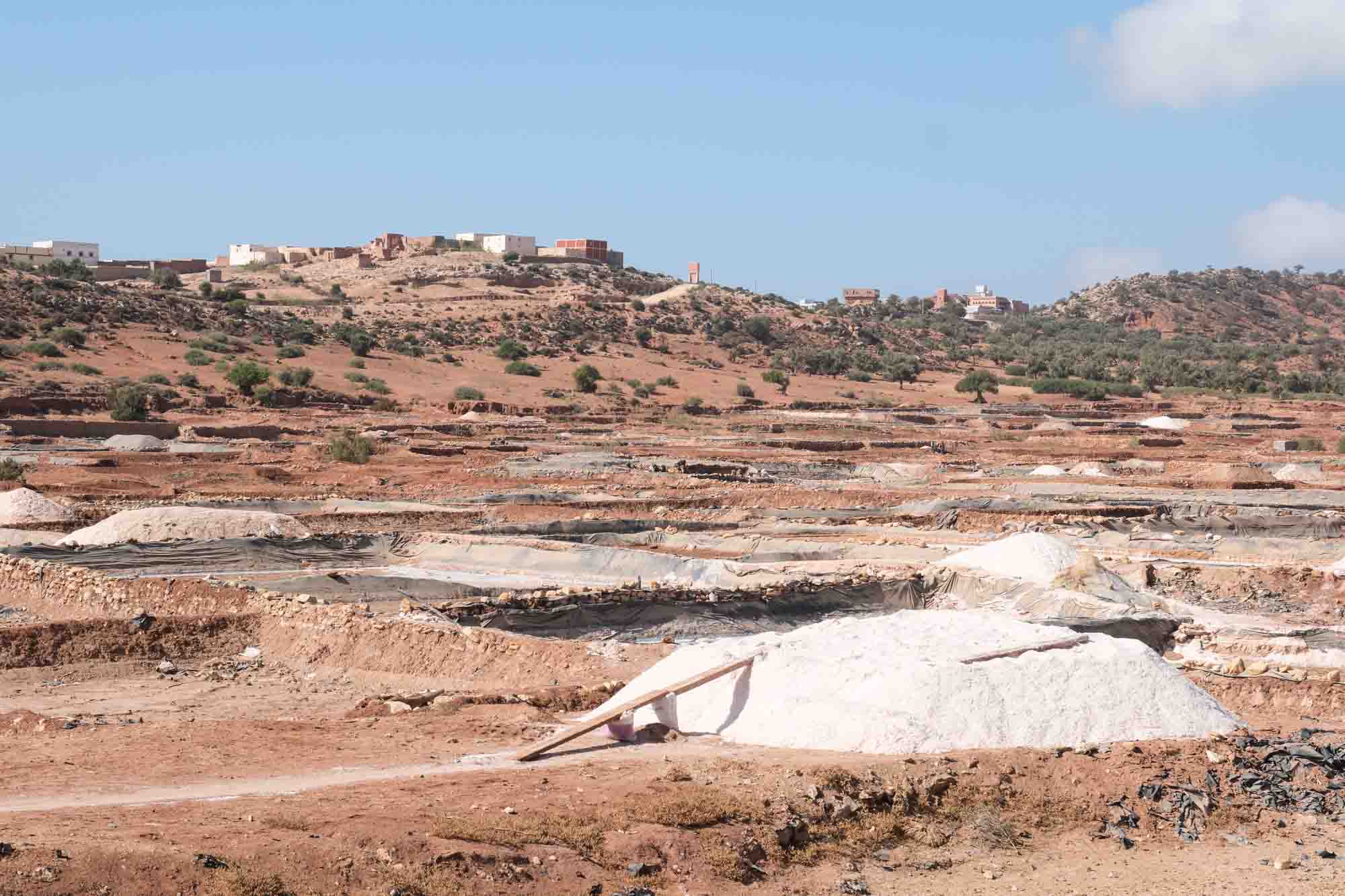 Il est temps de lever le camp pour poursuivre notre voyage. Nous suivons la route N1, puis nous bifurquons vers les salines d’Ida-ou-Azza où est extrait le sel gemme. En injectant de l’eau douce dans les galeries où se trouve le sel, l’eau devient salée et est mise ensuite à décanter dans des bassins, genre marais salants.