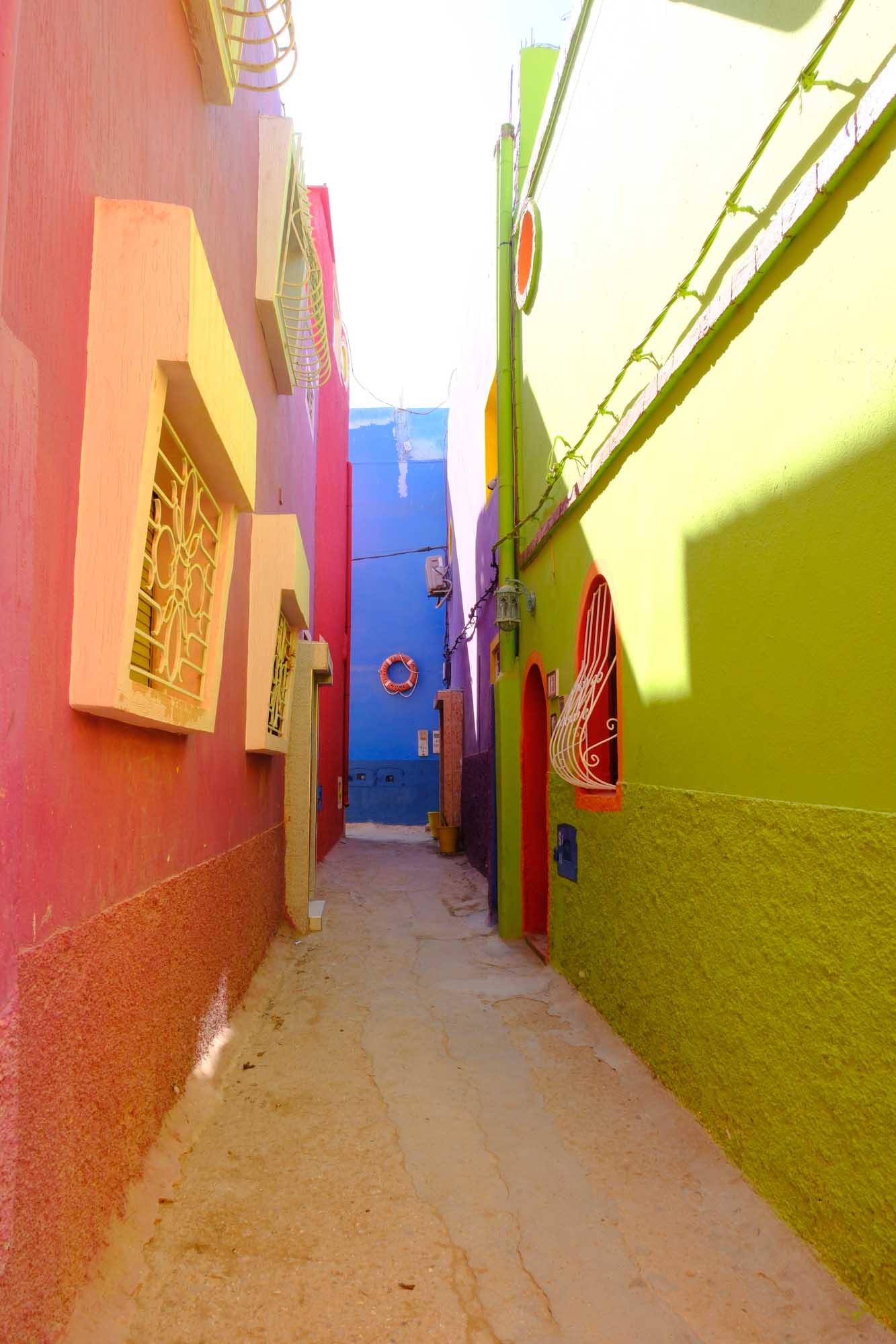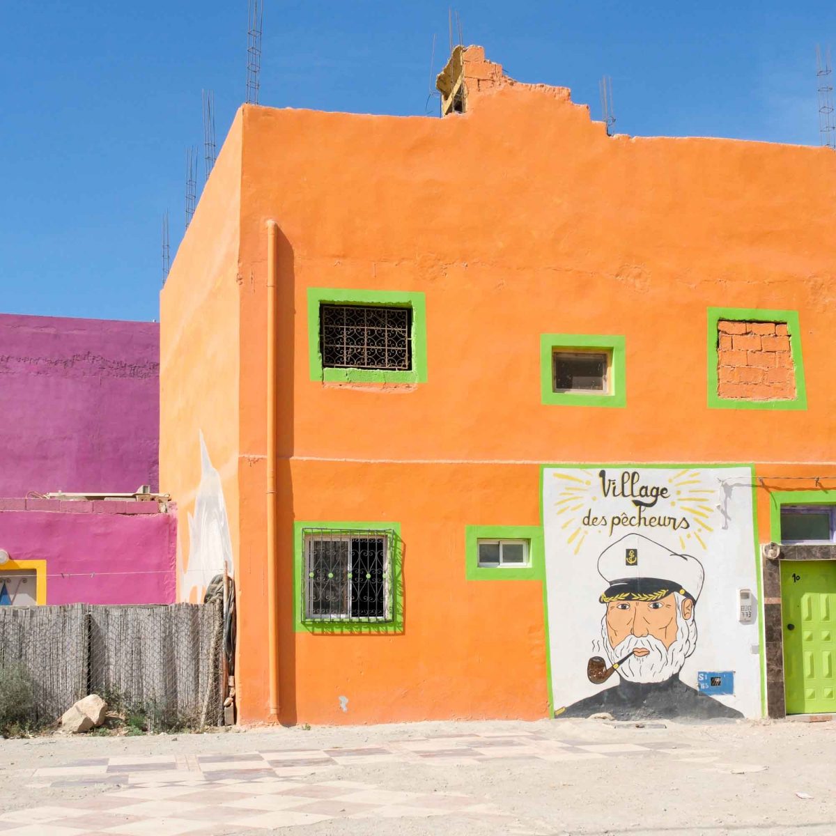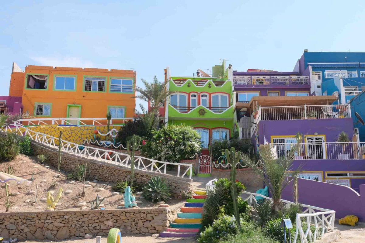 Il parait qu’un habitant du lieu, lassé de voir du gris, a eu l’idée un beau jour, de peindre sa maison de couleur vive. Les autres habitants, trouvant l’idée belle, se sont mis, à leur tour, à peindre leur maison. Ça donne un résultat original et joyeux, surtout avec la grande plage en arrière.