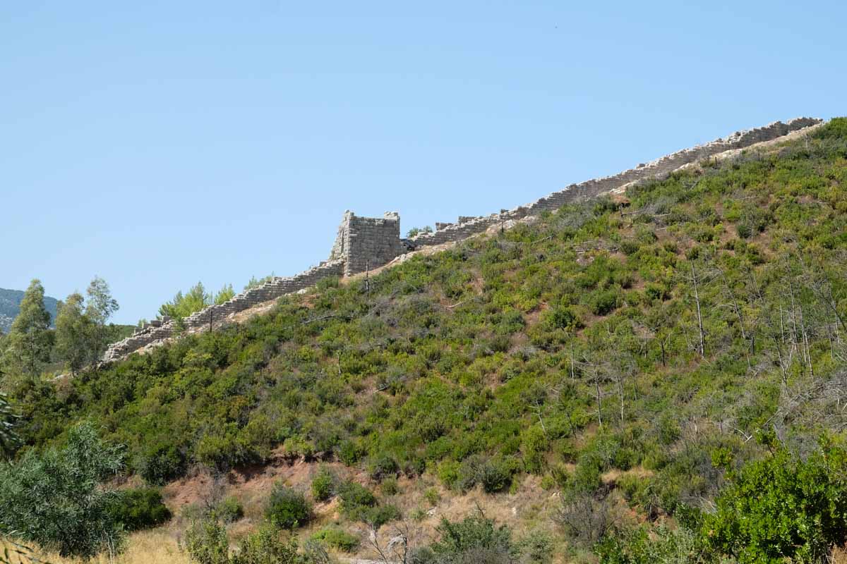 C’est une fortification qui grimpe dans la montagne. Nous nous installons face à cette « petite muraille de Chine » pour déjeuner dans un coin ombragé par un bouquet d’eucalyptus…
