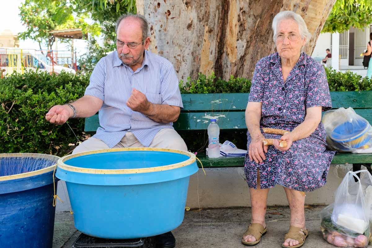 Nous nous reposons un instant sur un banc à l’ombre (il fait très chaud). En face de nous, un couple de personnes âgées est assis au frais… L’homme prépare des hameçons pour une pêche future… La femme, essaie d’échanger quelques mots mais elle ne parle que grec…Mais pas nous ! Elle nous offre très gentiment un morceau de « koulouri », petit pain en couronne parsemé de graines de sésame, très apprécié ici.