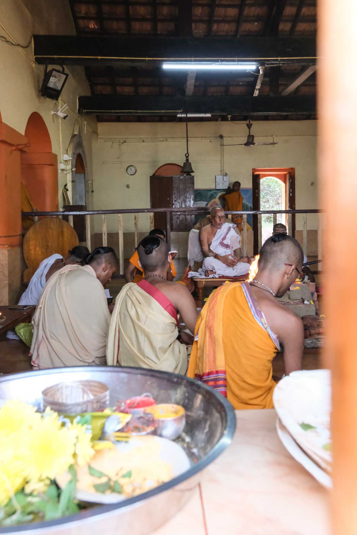 Dans le temple, des prêtres et des élèves brahmanes psalmodient des mantras