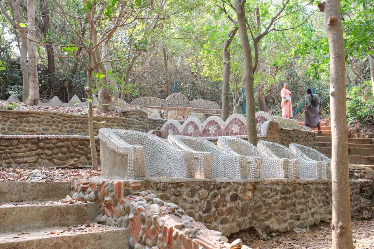 Dans un petit parc au-dessus de la plage, des sièges et un décor de style gaudien