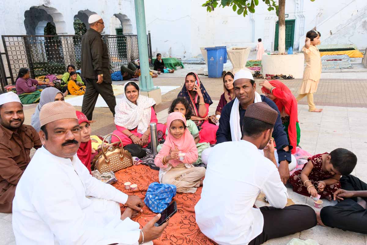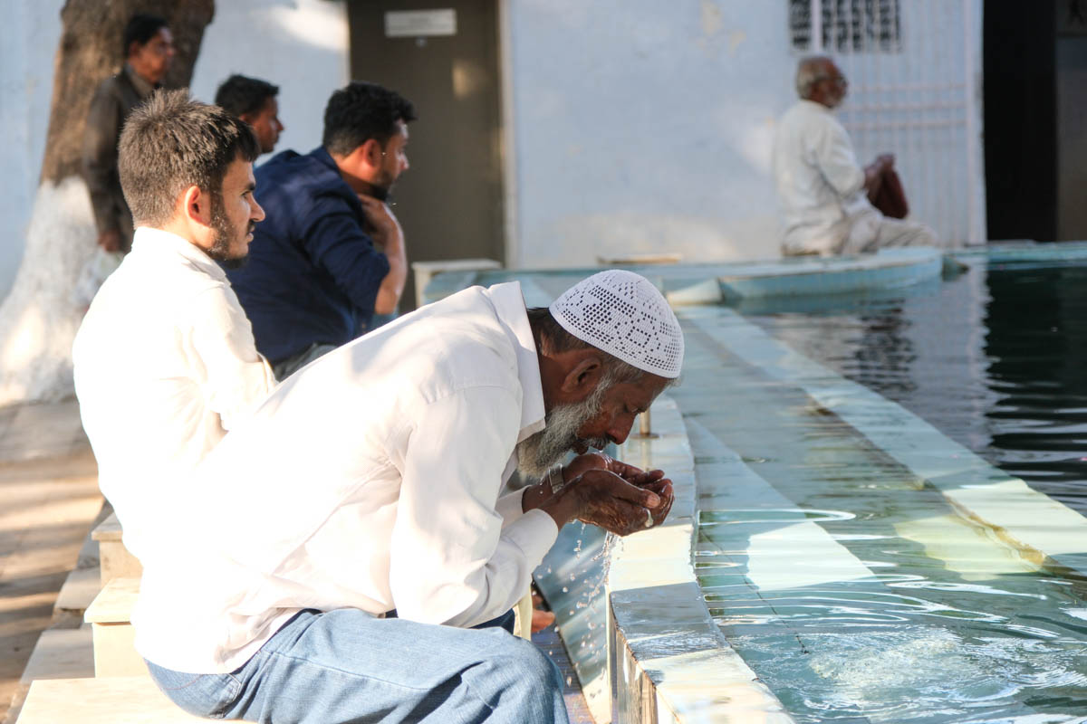 Il y a plein de monde. C’est très grand et très beau. Un grand bassin d’ablutions, plusieurs mausolées, plusieurs cours et une mosquée forment cet ensemble.