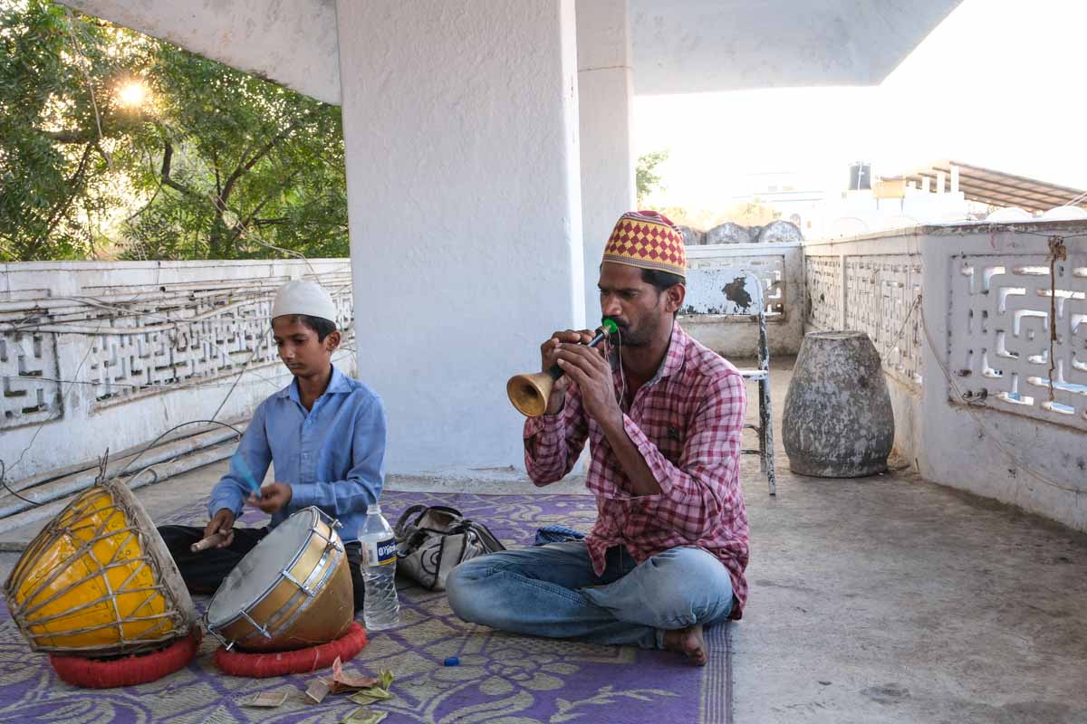 Après nous être reposés et abreuvés dans une gargote à chai et dégusté quelques petits gâteaux secs, nous nous apprêtons à quitter l’endroit quand nous entendons de la musique.