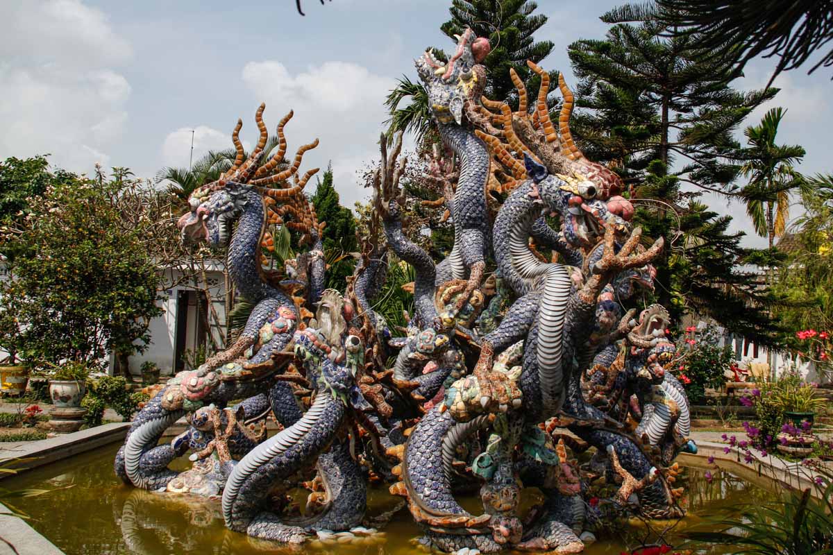 Superbe dragon en mosaïque de céramique dans le bassin de la cour du temple Quang Dong