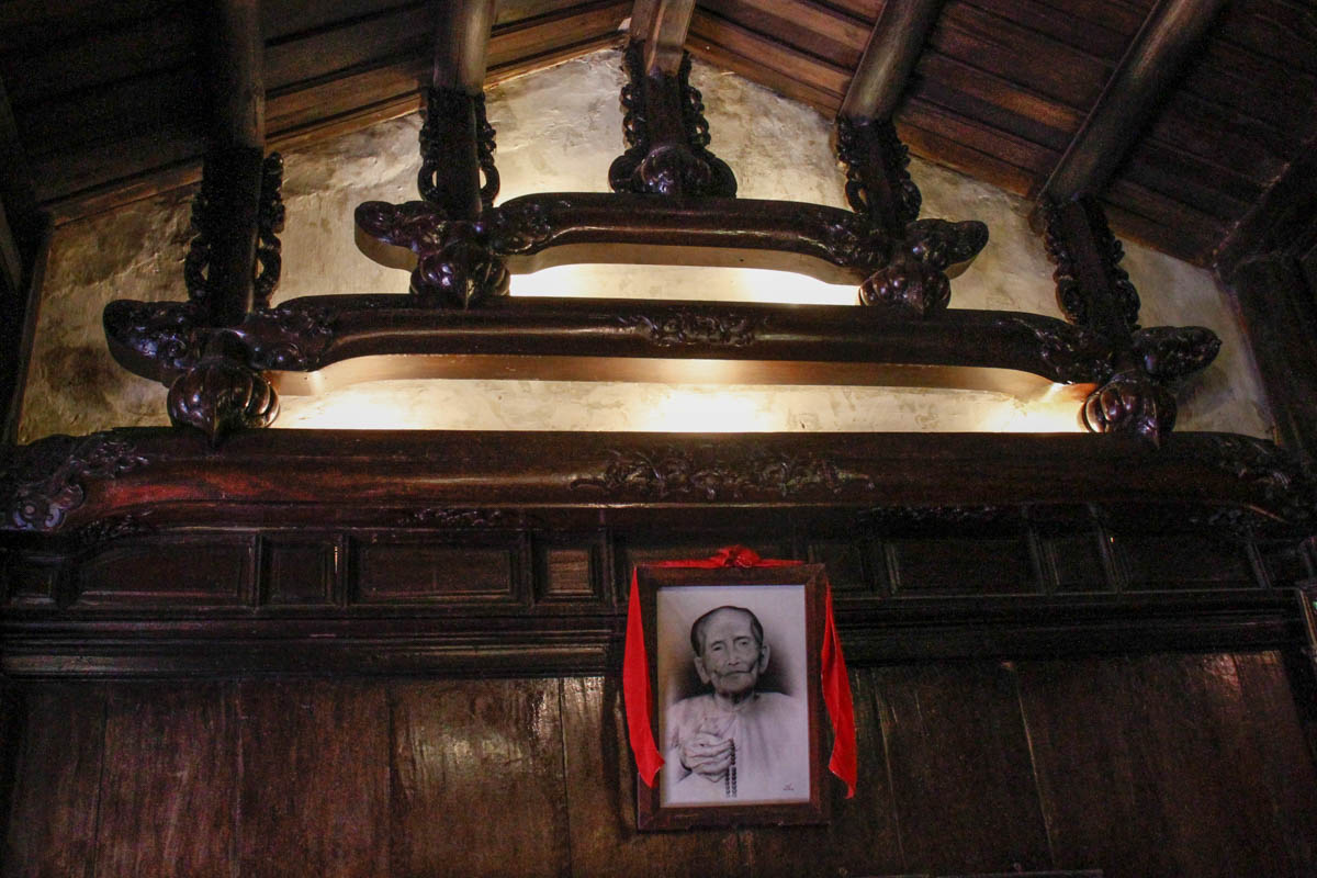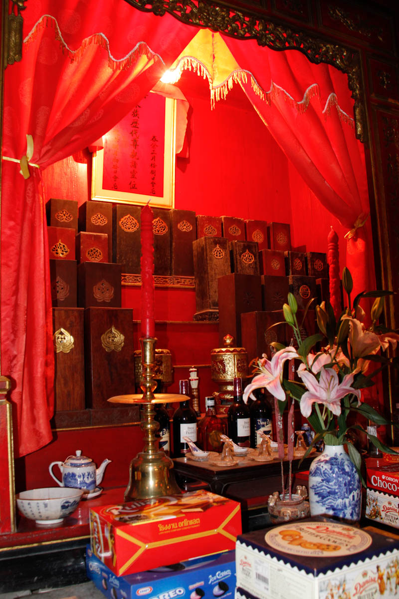 Sur l'autel de la maison de la famille Tran, les longues boites en teck contiennent les reliques des ancêtres.