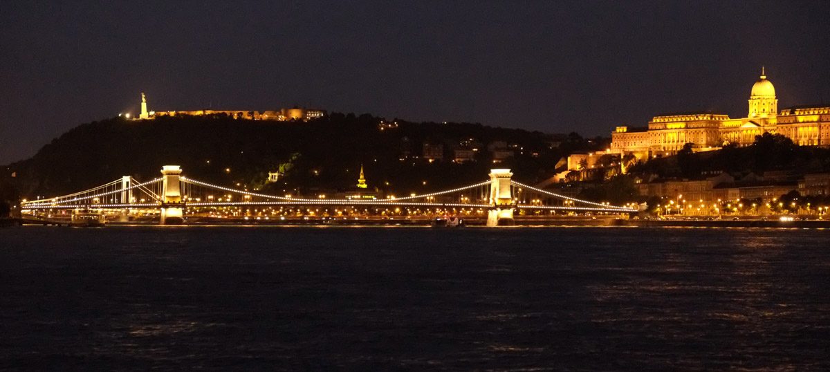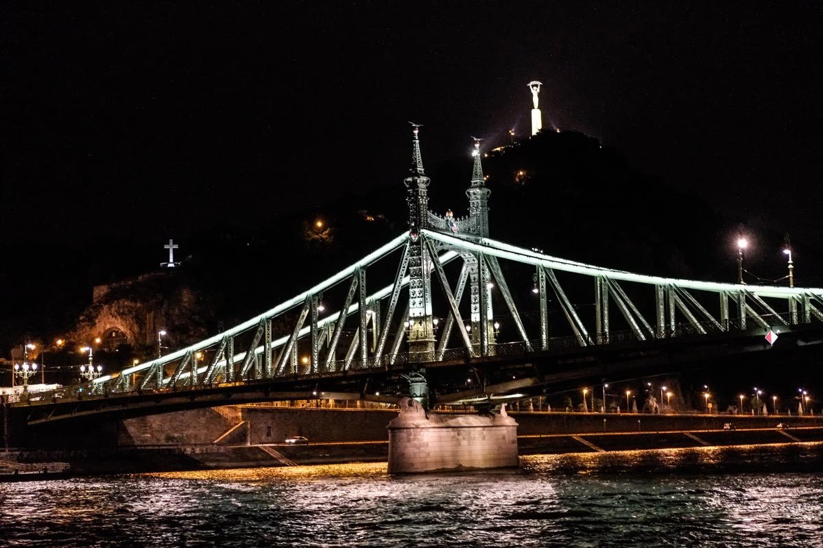 Le Pont des Chaînes illuminé et, en arrière, le mont Gellert où se dresse la statue de la Liberté