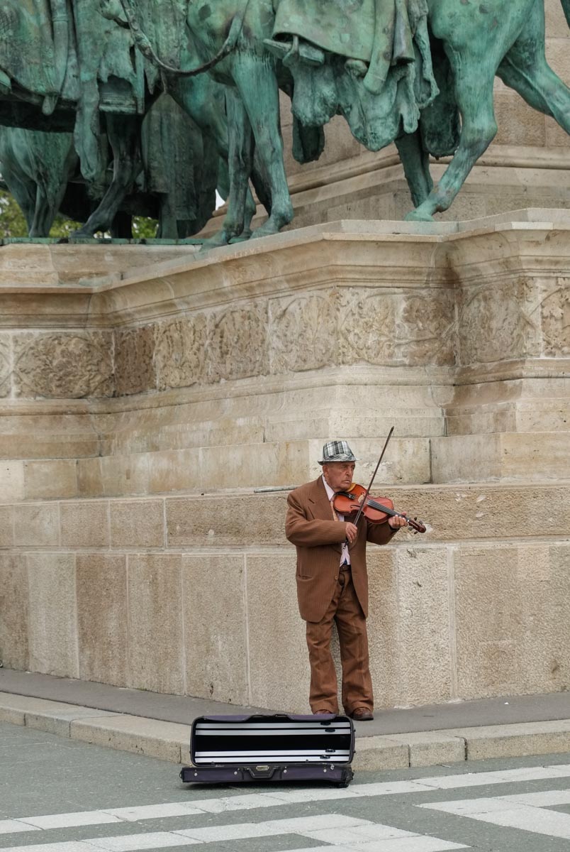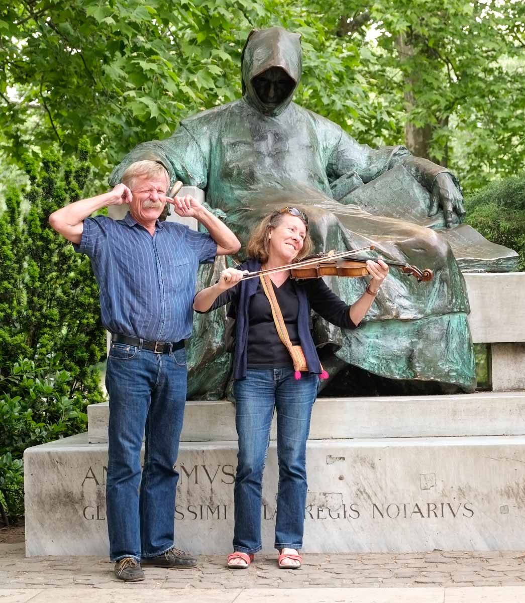 Devant la statue du chroniqueur Anonymus 1er, un musicien a trouvé le bon truc pour faire la manche : faire "jouer "les touristes sur son violon !!!