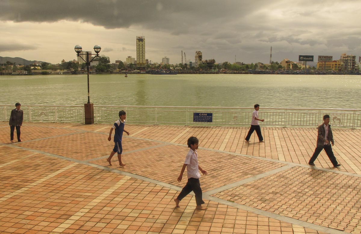 Da Nang... Le bus s'arrête quelques instant devant l'esplanade où des jeunes jouent au ballon...