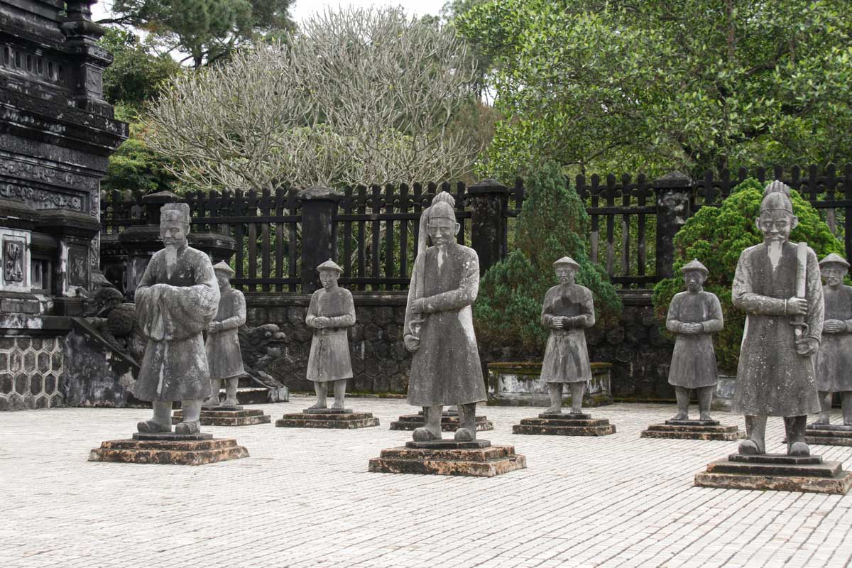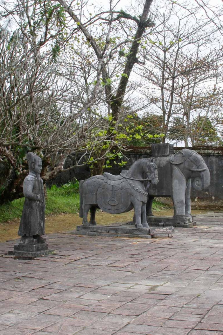 Dans la cour d'honneur, s'alignent les statues de mandarins, cheval, éléphant et guerriers au garde-à-vous
