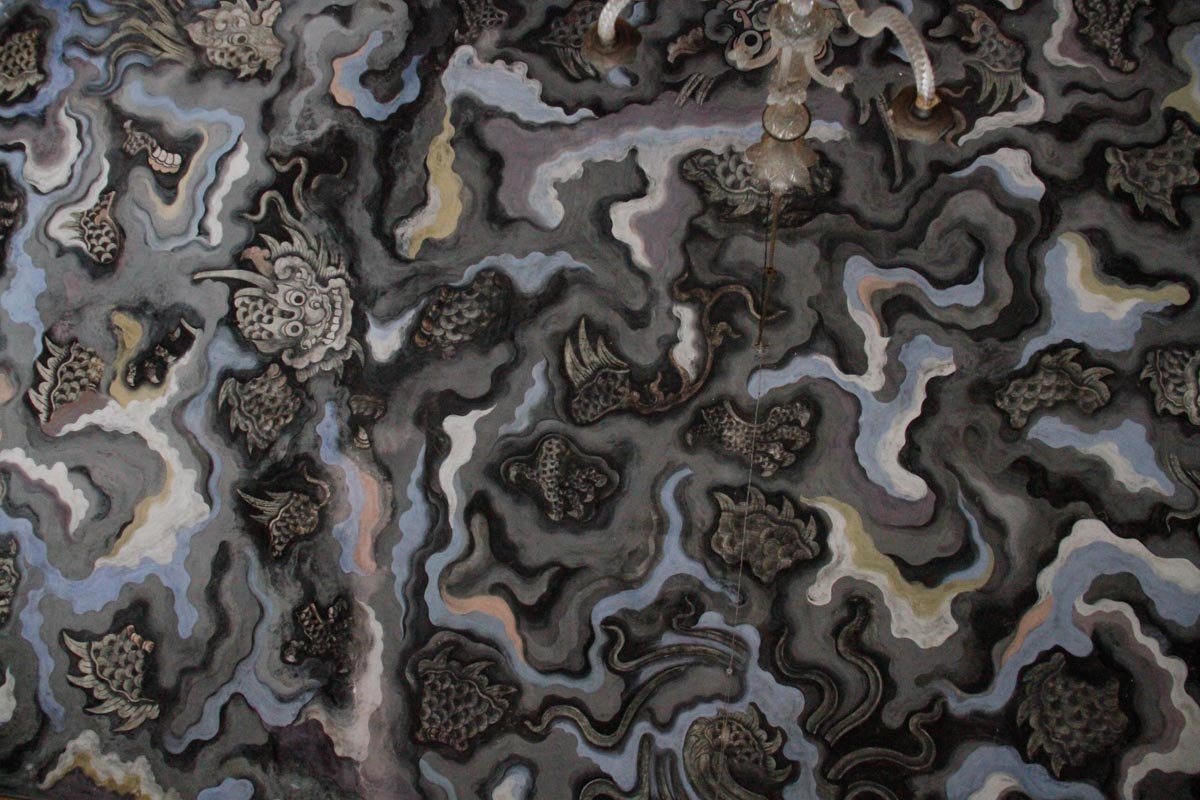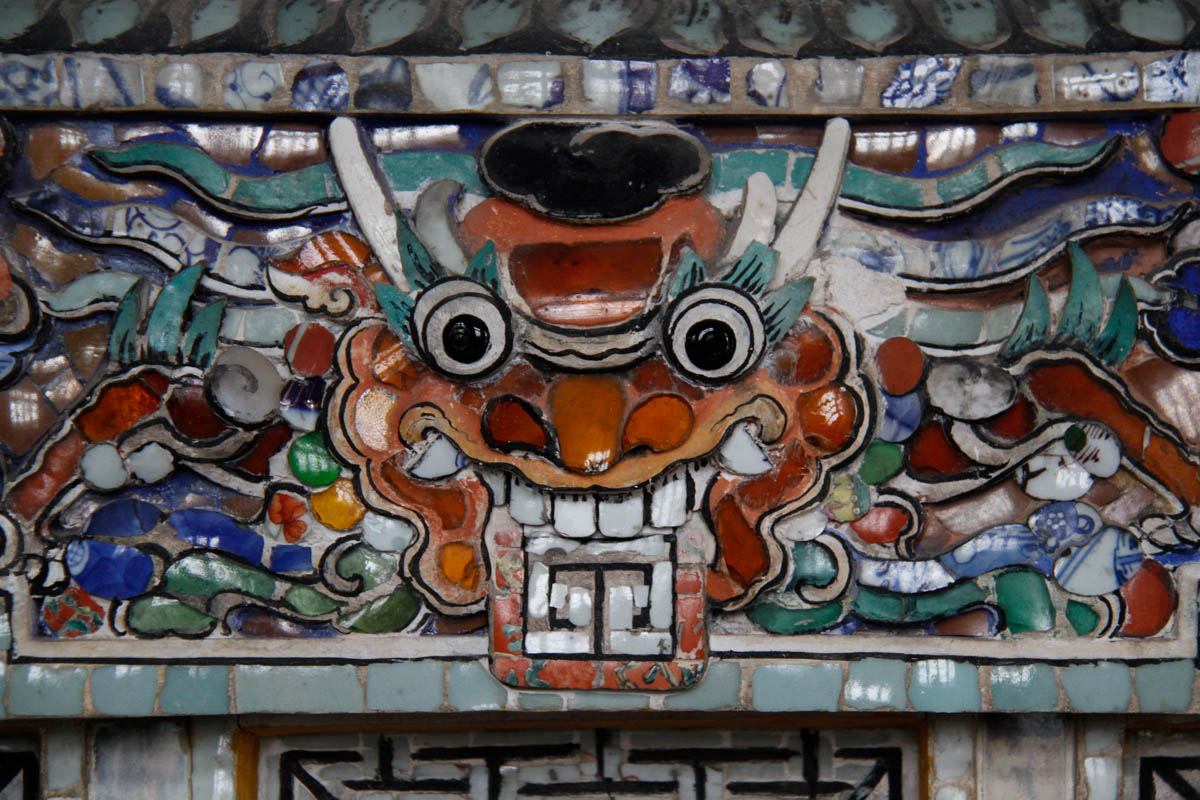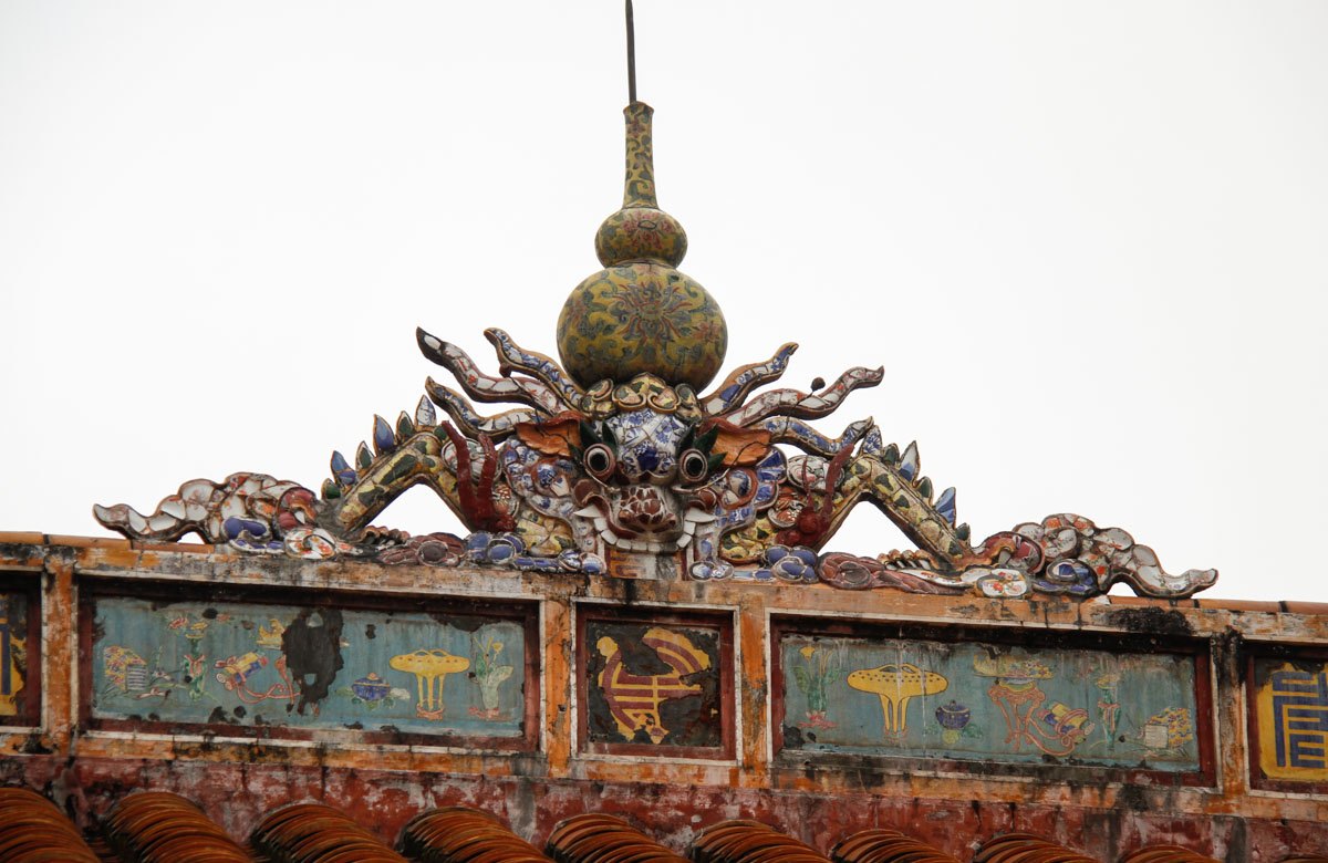 Sur le toit du temple du Culte du roi (ou de la Grâce immense), frise de peinture émaillée d'origine