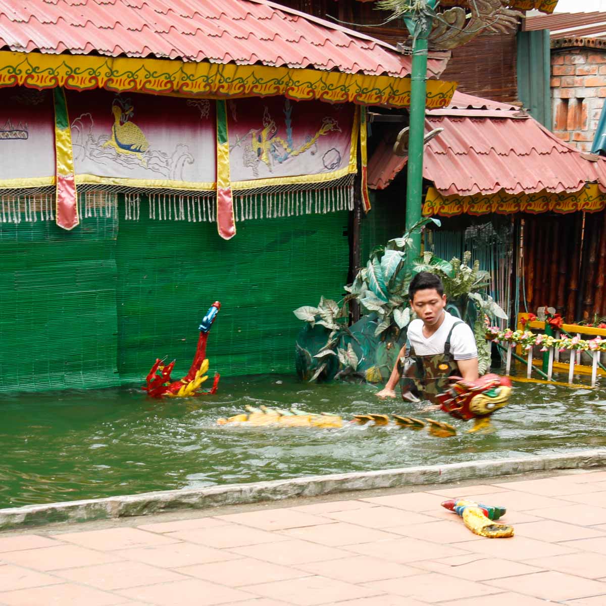 En cours de route, nous tombons sur un endroit où un gars est en train de s’entraîner à manipuler des marionnettes sur l’eau. Nous en verrons une représentation à Hanoï…