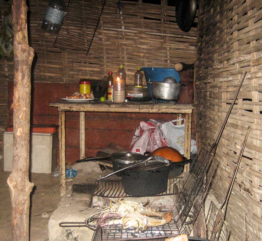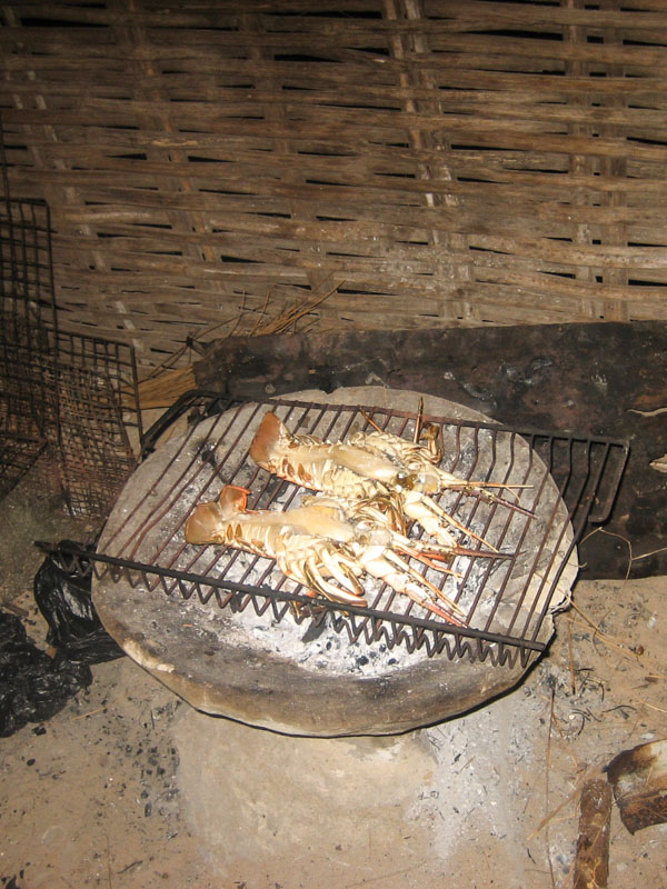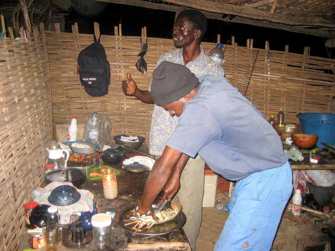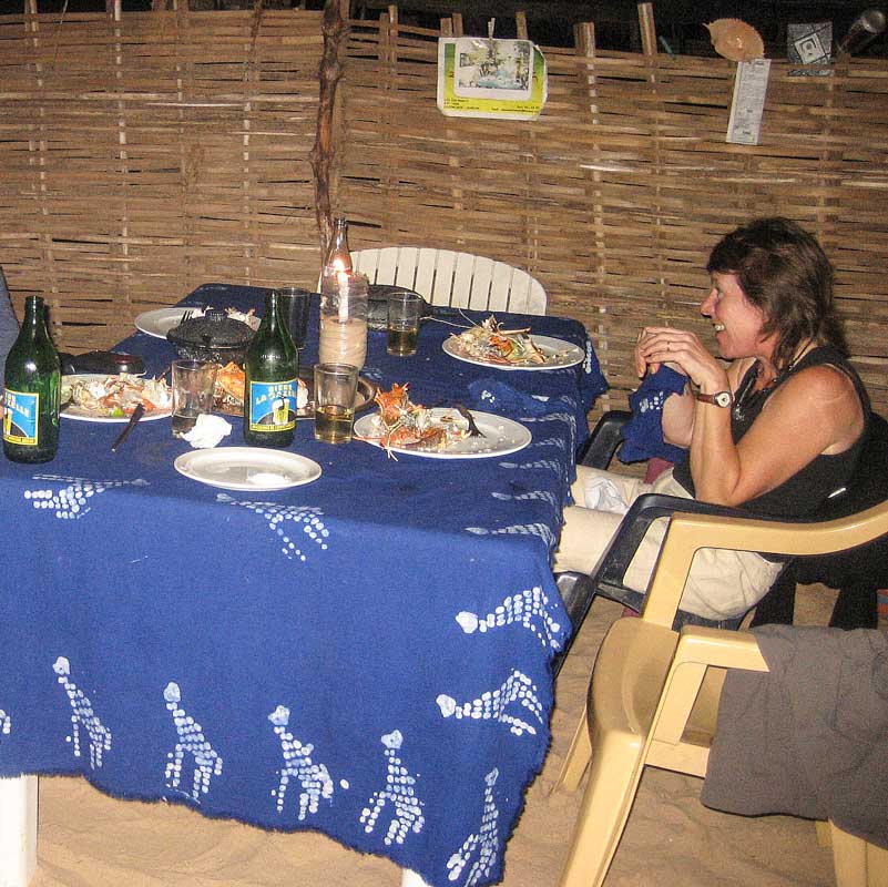 Nous sommes épatés et émus de voir ces hommes faire tout leur possible avec peu de moyen pour nous servir un repas digne d’un bon restaurant : gambas et langoustes grillées, riz, frites, sauce « miam miam », bananes et mandarines…