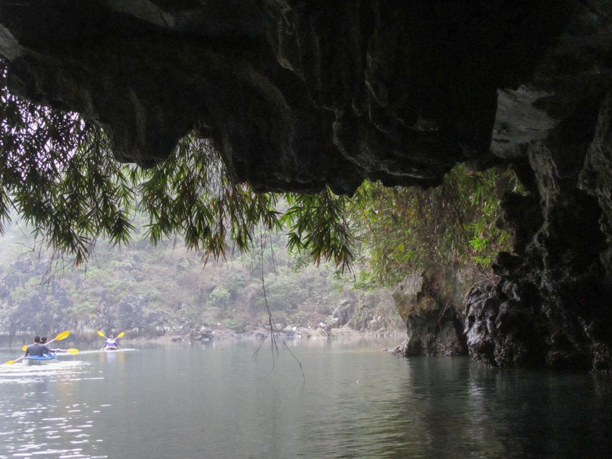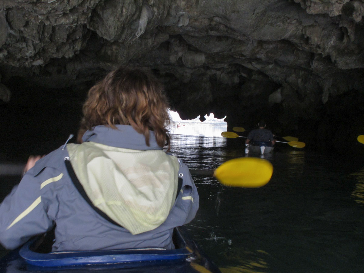 Avec les kayaks, nous passons dans des boyaux sous les roches en pain de sucre...