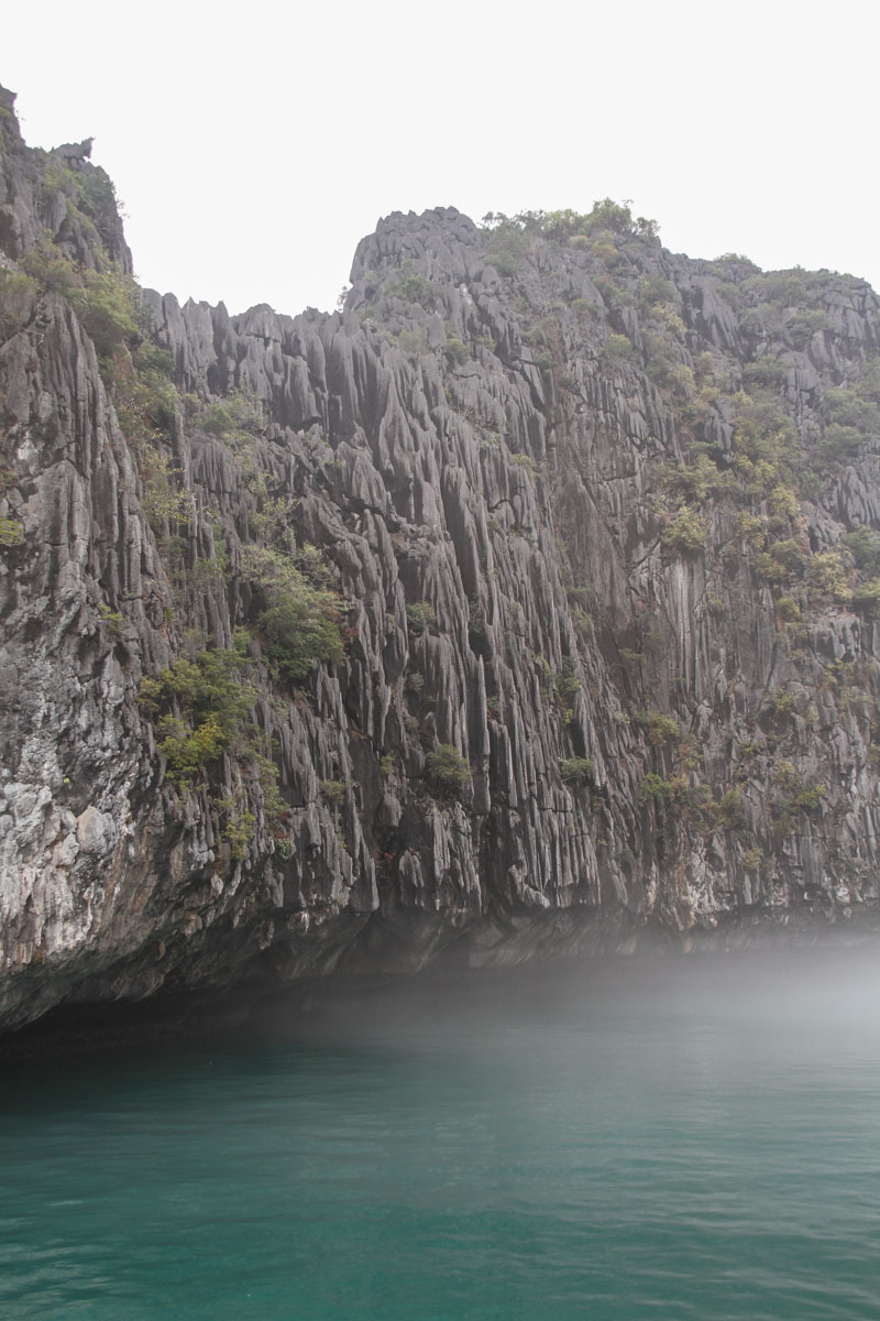 À bord de nos légères embarcations, nous nous faufilons entre les collines rocheuses et sous des galeries à leur base…Impressionnant…