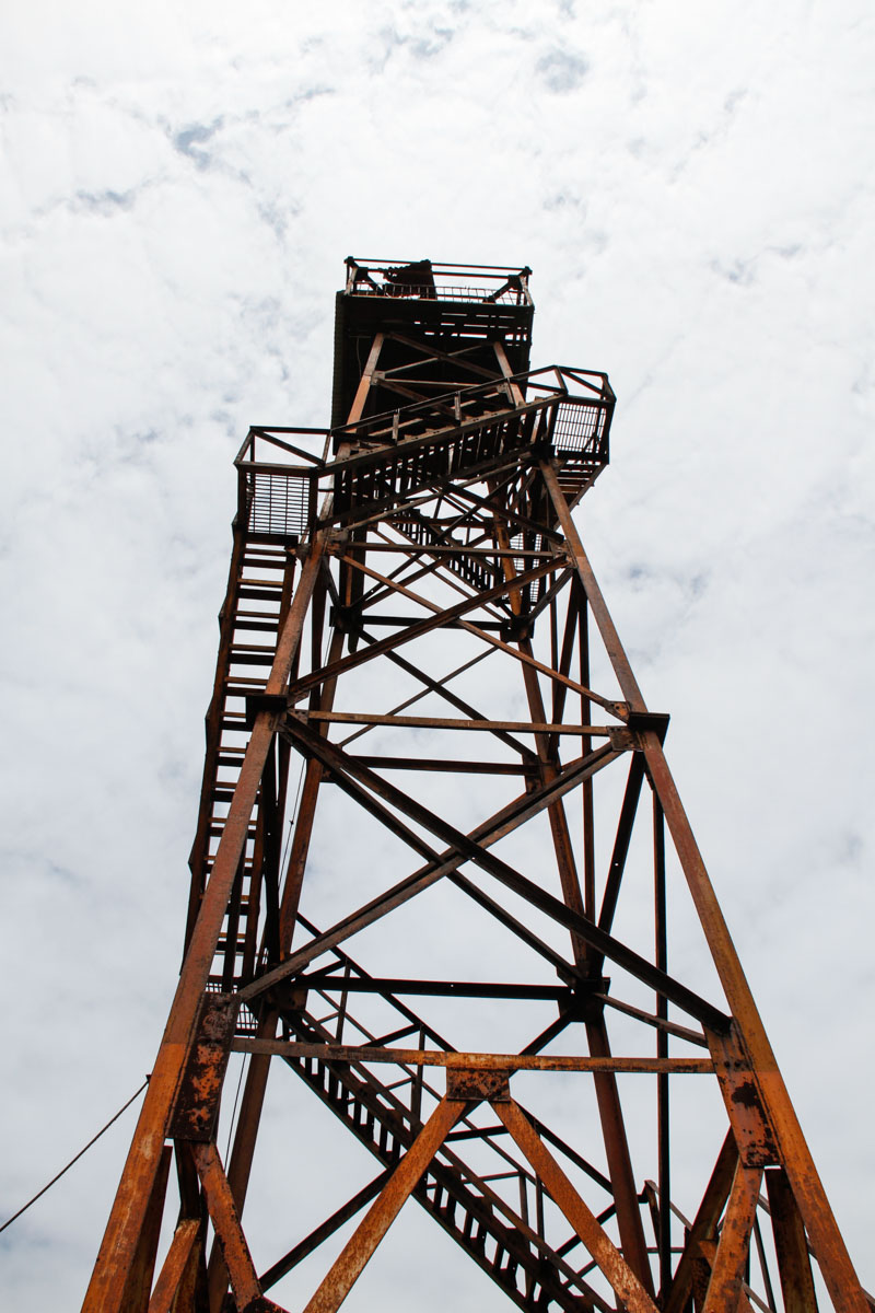 Vers le haut du piton rocheux, il faut escalader quelques échelles métalliques plutôt rouillées et, une fois en haut, une échelle de fer très raide et vertigineuse permet de grimper au sommet d’une tour métallique. De là-haut très belle vue sur la canopée.