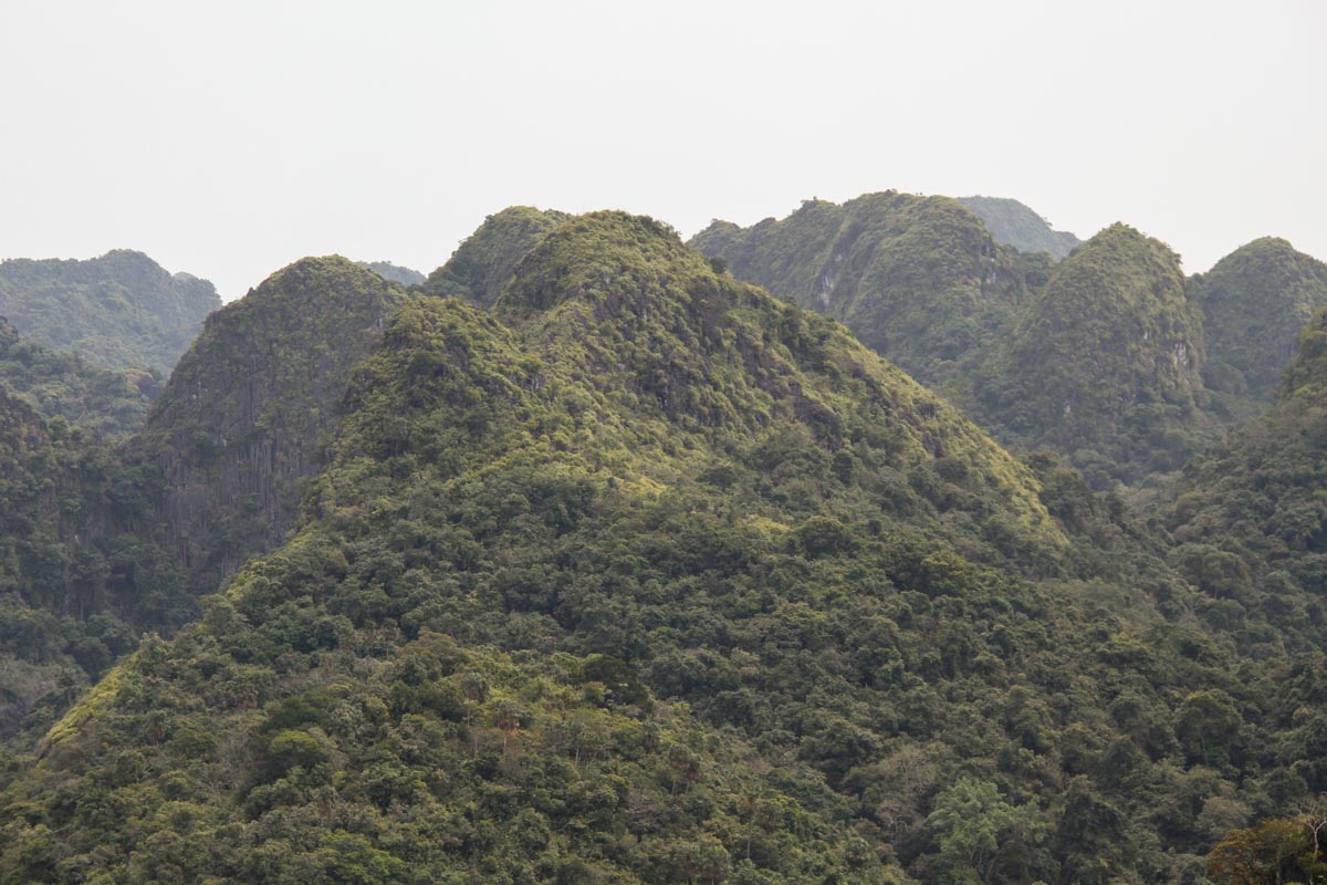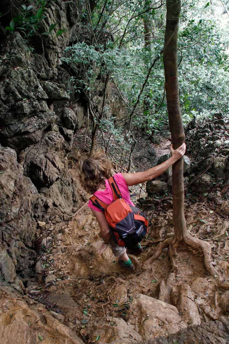 Il fait beau mais cette nuit il a plu, ce qui rend le sentier boueux et glissant. Il grimpe raide parmi les roches jusqu’au sommet du Kim Giao.
