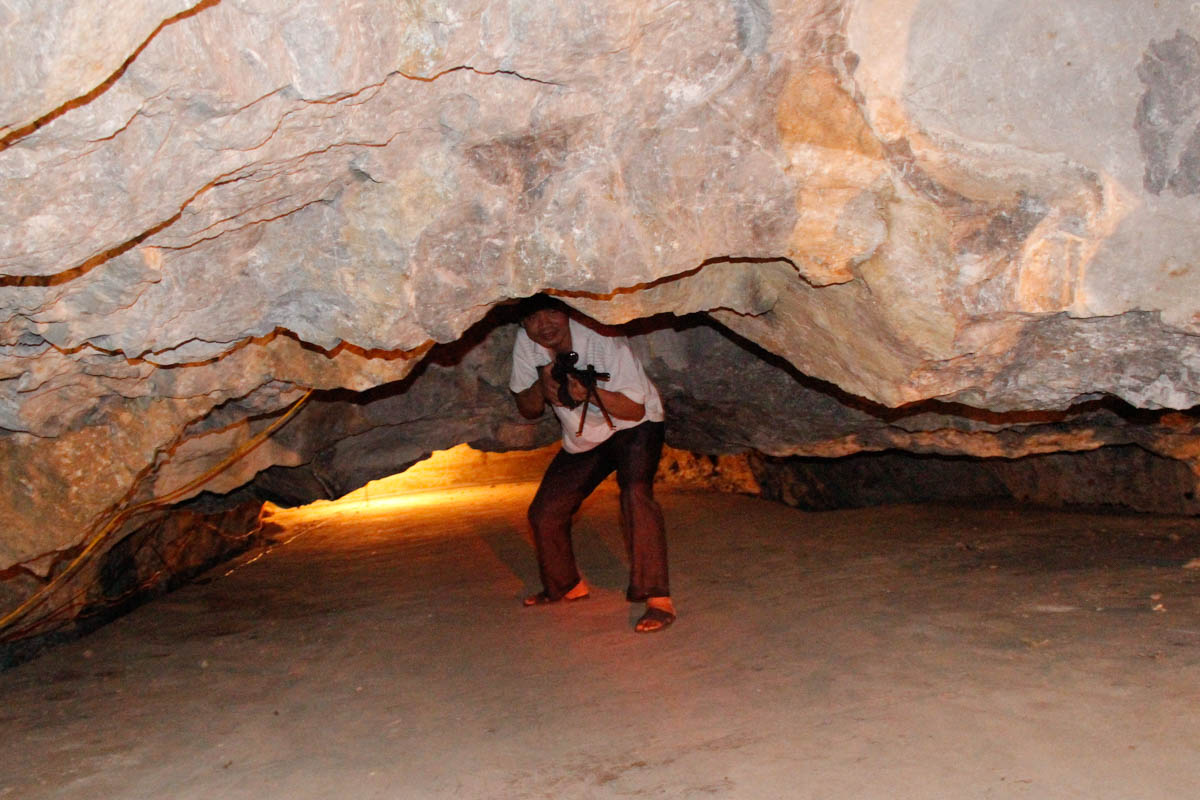 Un gars mime la façon dont les soldats Vietcong défendaient l'hôpital installé dans la grotte