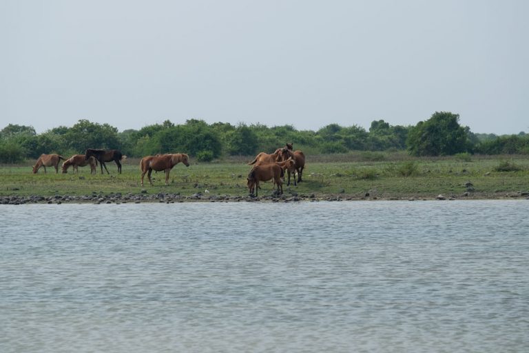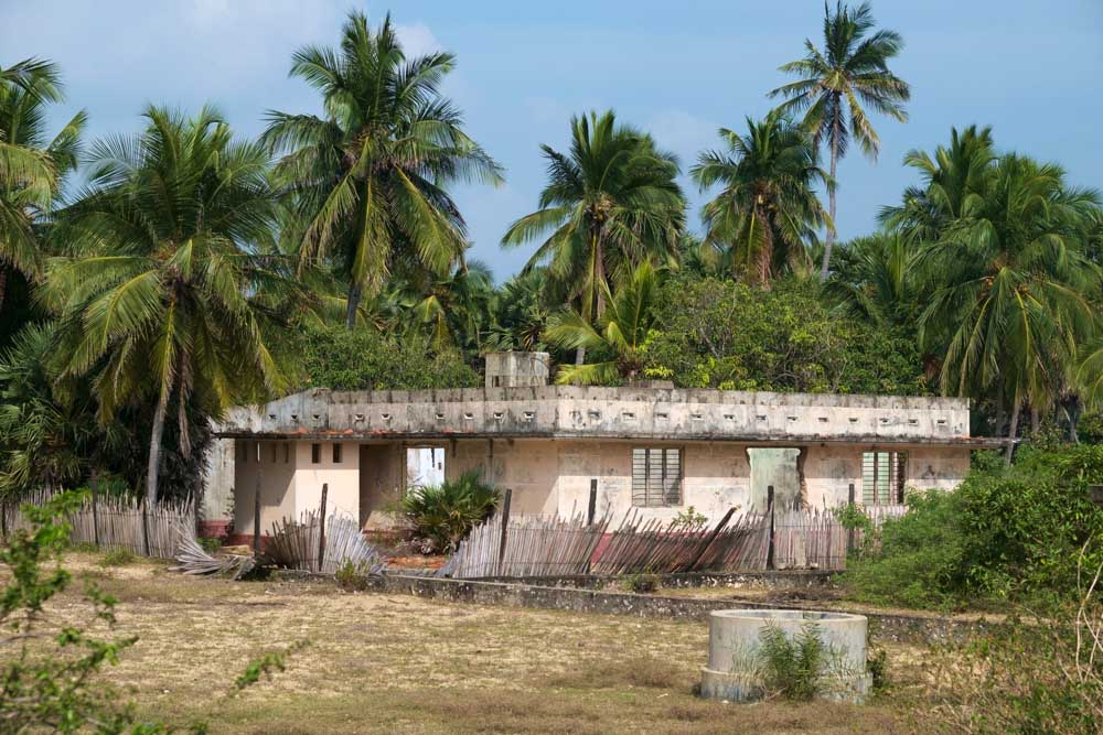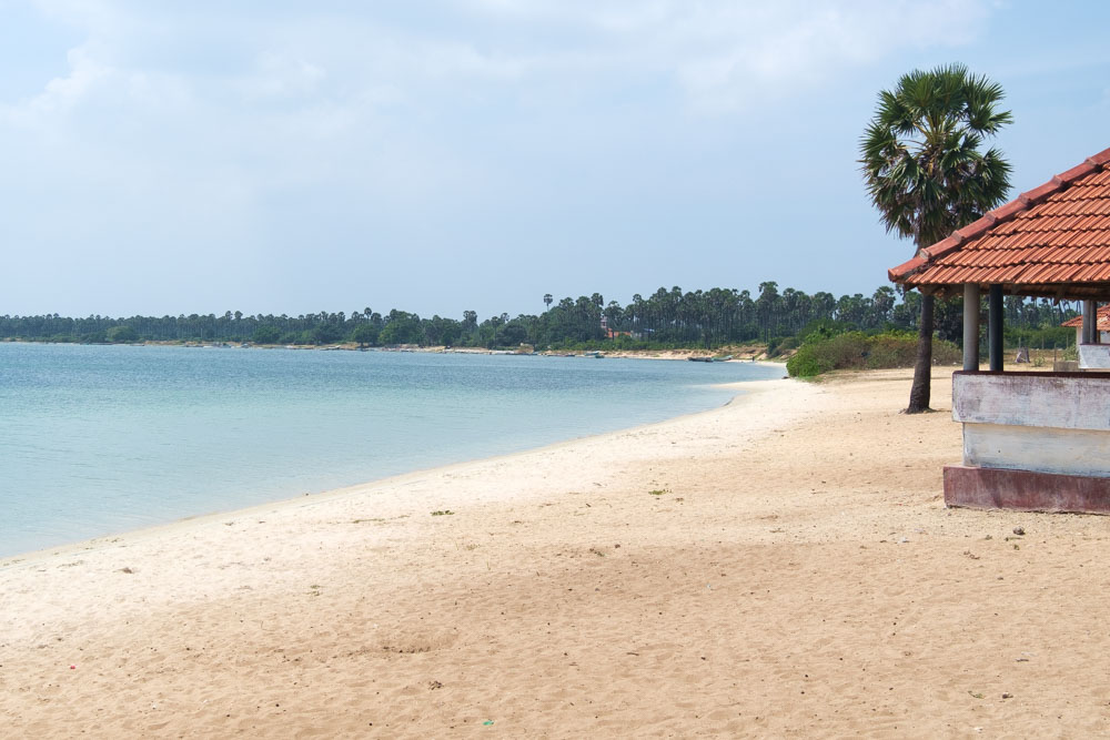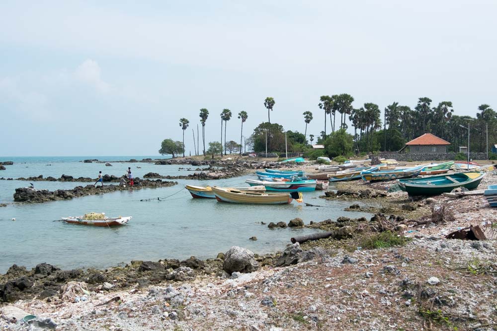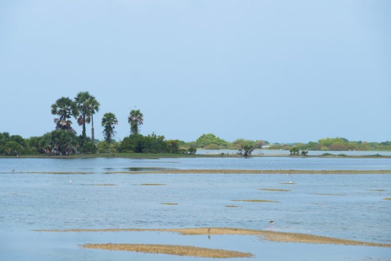 Nous partons donc à vélo le long des rues animées et nous franchissons la chaussée sur l’eau qui relie Jaffna à l’île de Velanai. Après 11kms de pédalage au milieu des marais, environnés d’oiseaux, nous arrivons à Chatty beach.