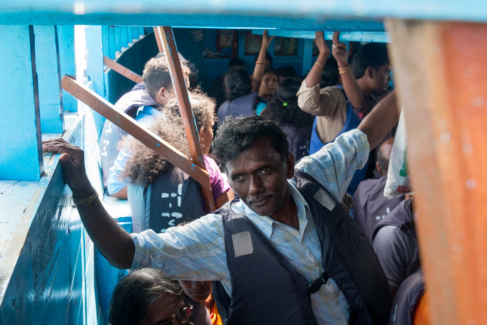 Le bateau est bourré de monde entassé dans la soute. Beaucoup de femmes avec bébés et petits enfants. Tous ces gens vont au grand temple Naga Pooshani Amman Kovil, où nous arrivons à temps pour assister à la puja (cérémonie) de la mi-journée.