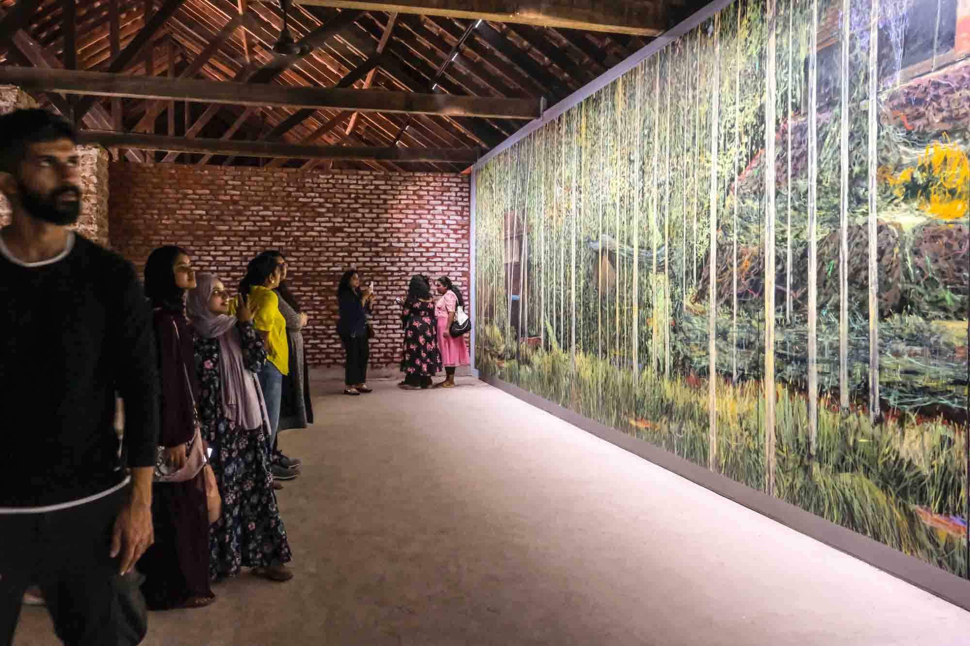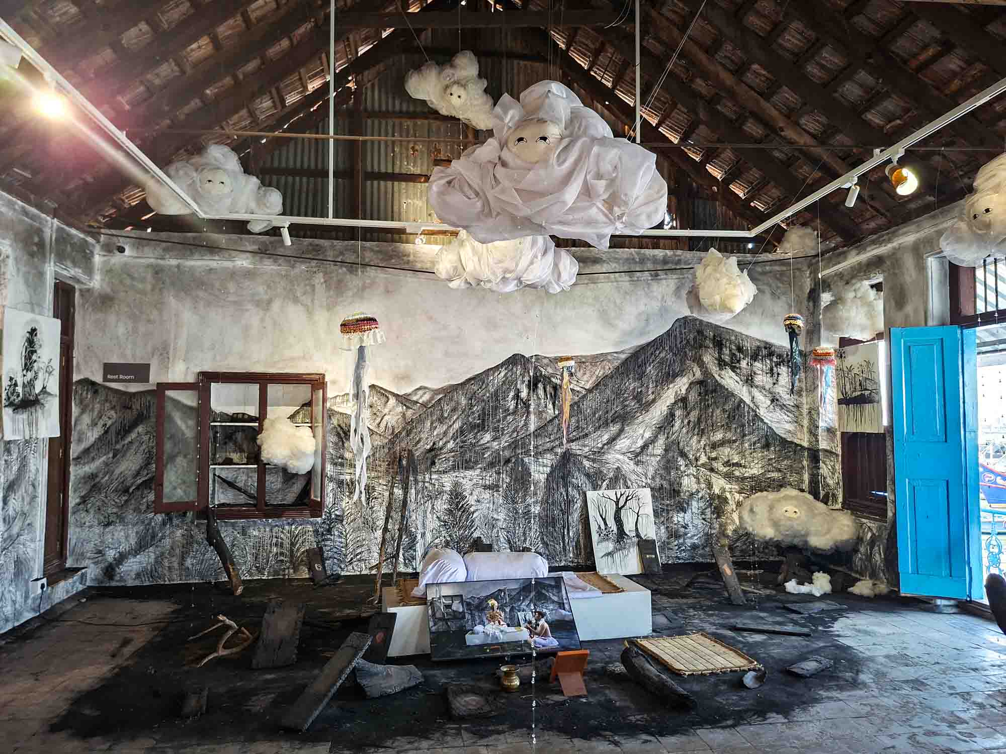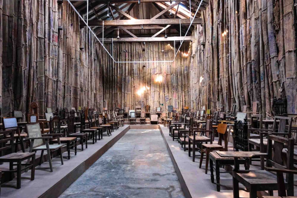 Cette année, a lieu la biennale d’art contemporain à Kochi et nous allons donc y passer la journée. Nous nous rendons à pied au bâtiment principal « Aspinwall House », où se tient la plus grande partie de l’expo, le reste s’étalant dans plusieurs bâtiments le long de Bazaar Road… (et d’autres encore, plus éloignés)