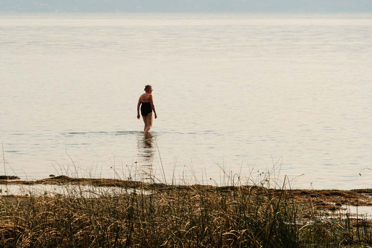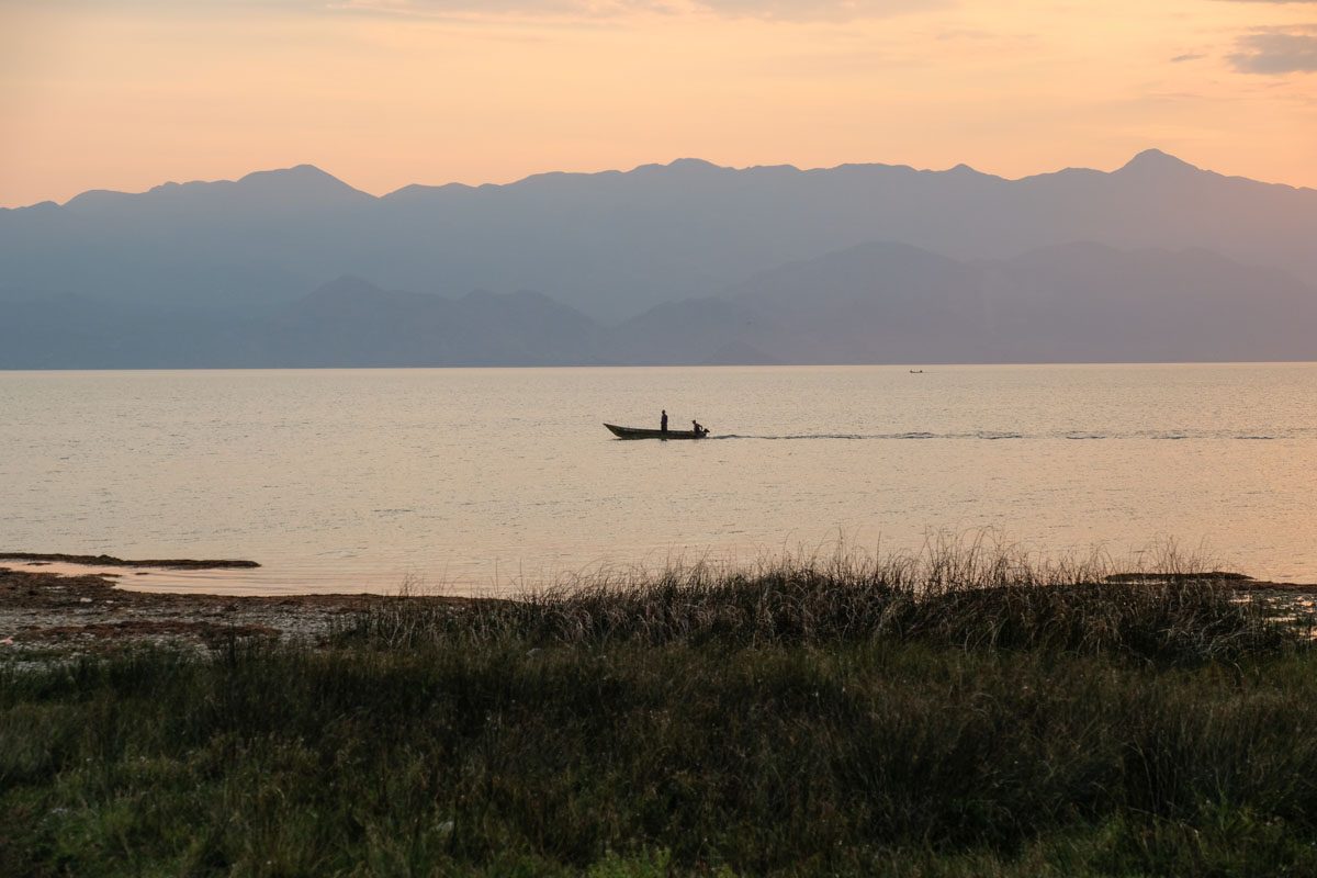 Nous sommes en pleine nature, face au lac où nous nous baignons et assistons au superbe coucher de soleil…