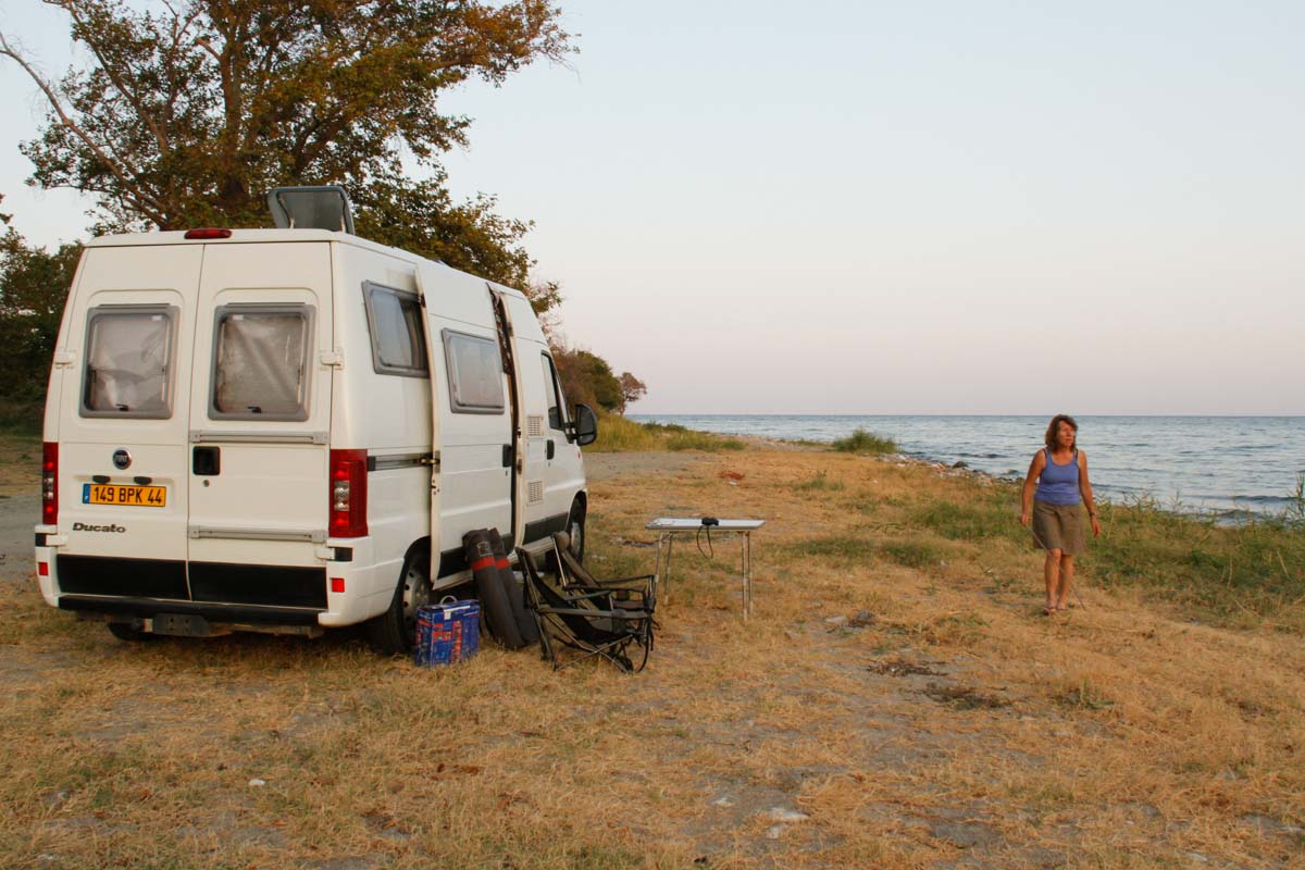 À Asprovalta, nous faisons halte au bord de la mer Égée dans un coin tranquille près d’une petite plage où nous sommes tout seuls…