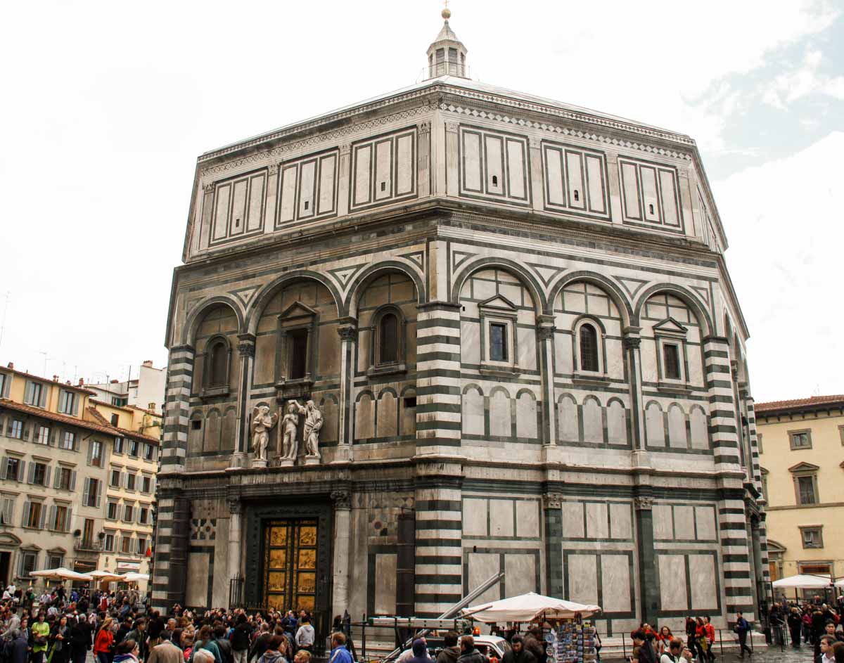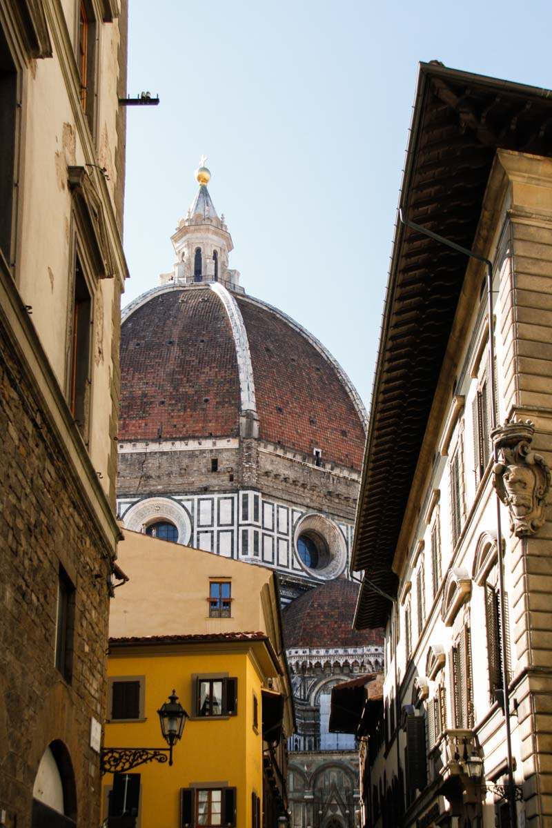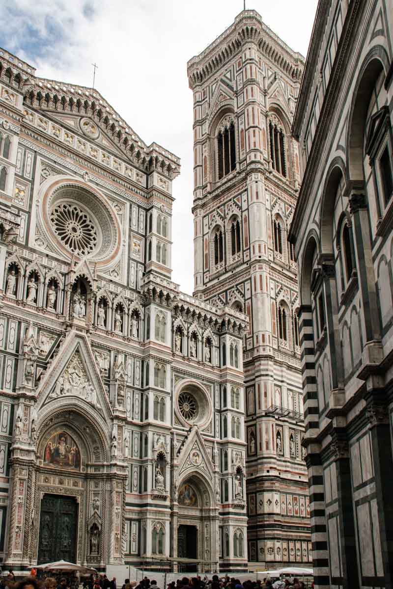 Un gros orage éclate et nous cloue sur place jusqu’après le déjeuner… Quand la pluie cesse enfin, nous prenons le bus pour le centre-ville et nous arrivons devant l’imposante Cathédrale Sta Maria del Fiore avec sa façade en patchwork de marbres et sa célèbre coupole…