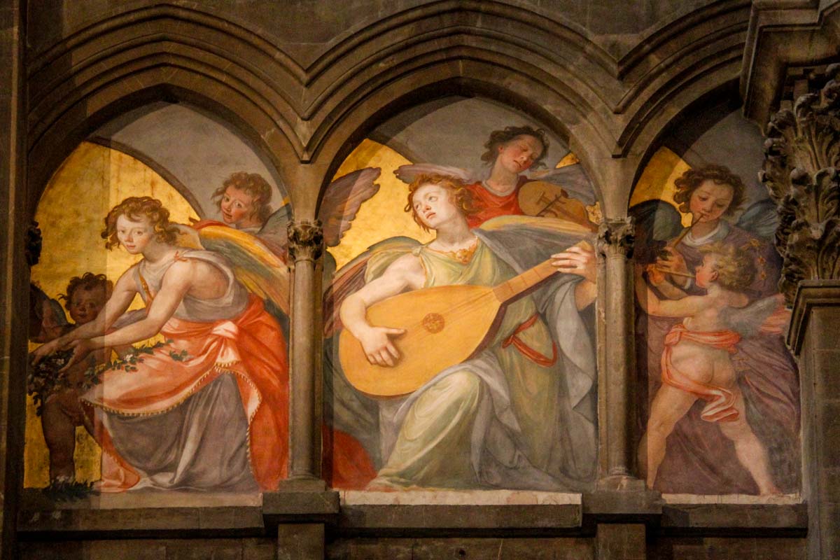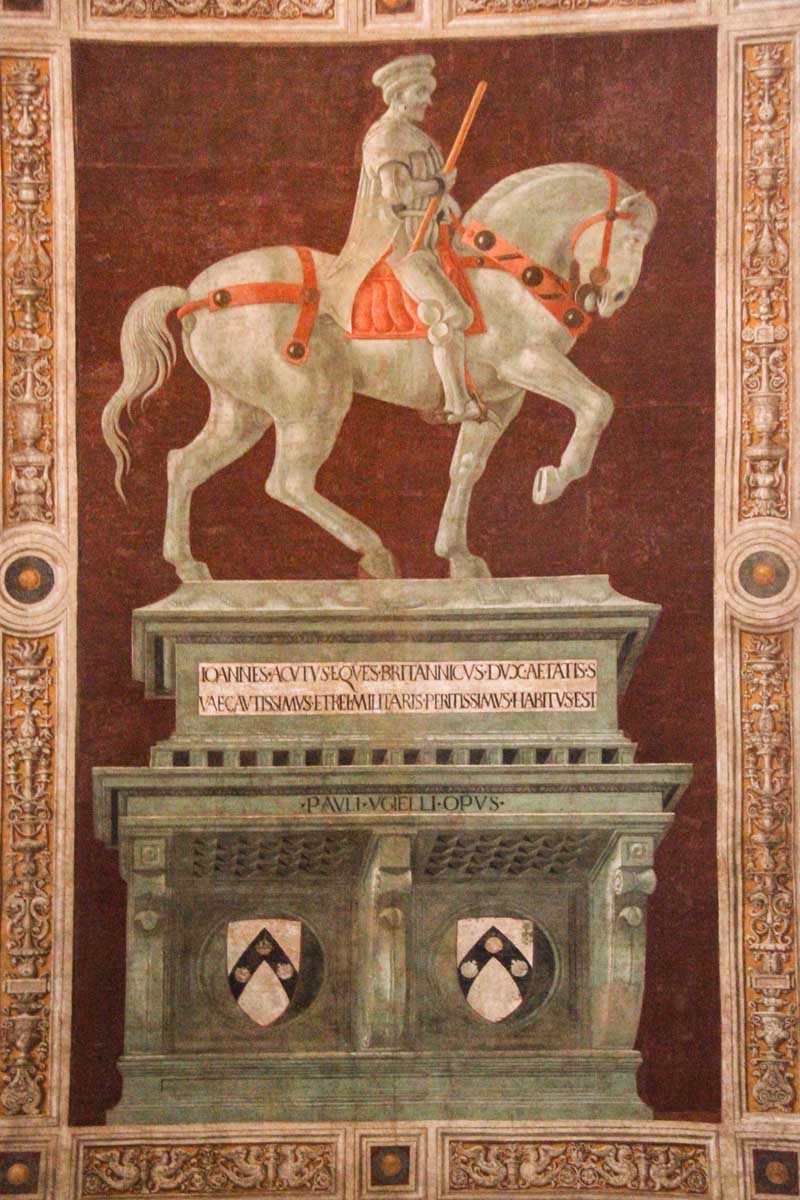 Belles fresques d’anges musiciens et, de chaque côté de la nef, les cavaliers, l’un de Paolo Uccello et l’autre, d’Andrea del Castagno…